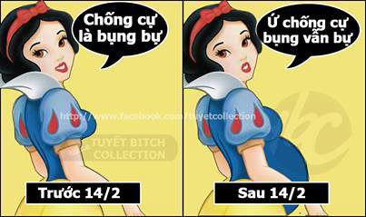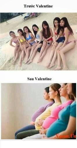 Nhiều bức ảnh chế đã chỉ ra, những bạn trai đang yêu qua Valentine sẽ nhẵn túi và trông xác xơ như gà trống rụng lông. Còn những bạn nữ, qua mùa yêu đương là nỗi lo… bụng to ra.