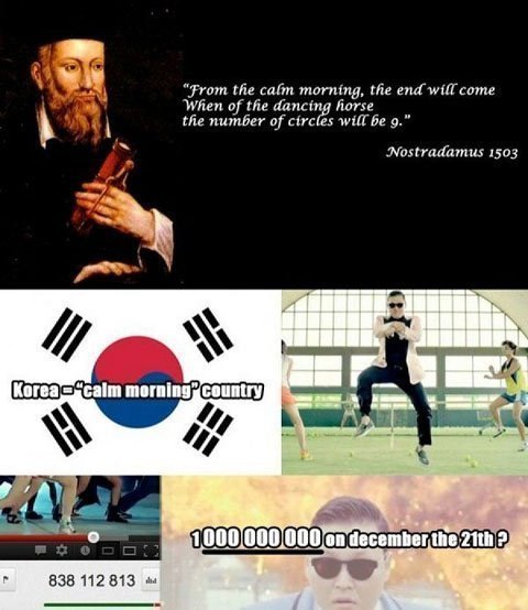 Lời đồn đoán về mối liên hệ giữa điệu nhảy Gangnam Style và Ngày tận thế khi nó đạt 1 tỷ lượt xem trên Youtube.