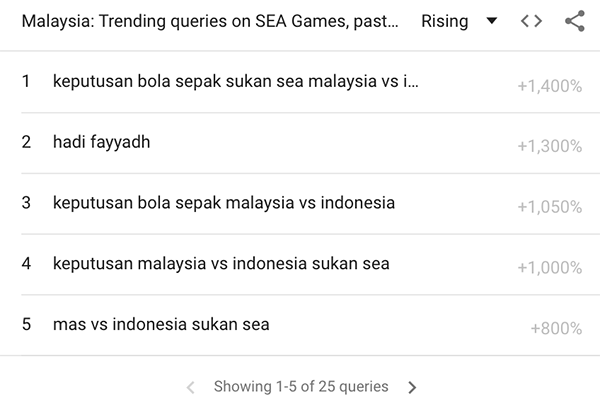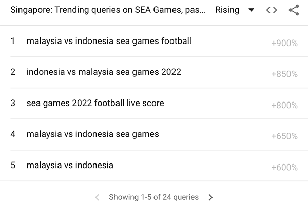 Cụm từ "Malaysia vs Indonesia SEA Games football" đang được tìm kiếm nhiều nhất tại Singapore, tăng hơn 900%. 4 trong 5 cụm từ được tìm kiếm nhiều đều liên quan đến trận đấu này. Điều đó cho thấy sự quan tâm của người hâm mộ Singapore đối với đội tuyển bóng đá U23 của họ.