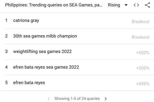 Tại Philippines, thông tin về bộ môn thể thao điện tử Mobile Legends: Bang Bang đứng thứ 2 trong top các từ khóa thịnh hành. Đây cũng là nội dung thi đấu đem về huy chương vàng cho Philippines tại SEA Games 31.