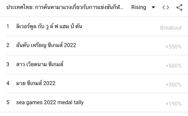 Tại Thái Lan, cụm từ "อันดับ เหรียญ ซีเกมส์ 2022" (xếp hạng huy chương SEA Games 2022) nằm trong top từ khóa thịnh hành trong 4 giờ qua, với lượt tìm kiếm tăng 550%. Lượt tìm kiếm về SEA Games Việt Nam qua cụm từ "สาว เวียดนาม ซีเกมส์" và thông tin về bộ môn quyền anh "มวย ซีเกมส์ 2022" đồng thời cũng được người Thái quan tâm tìm kiếm nhiều, lần lượt tăng 500% và 300%.