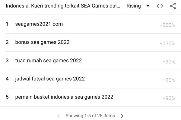 Trong 4 giờ qua, top các cụm từ tìm kiếm nhiều nhất liên quan đến SEA Games tại Indonesia là "SEA Games 2021 com" với lượt tìm kiếm tăng 200%. Mục đích của dân mạng Indonesia là muốn tìm kiếm trang web chính thức của kỳ Đại hội. Tiếp theo sau đó là cụm tìm kiếm "bonus SEA Games 2022" tăng 170% và "tuan rumah SEA Games 2022" (chủ nhà SEA Games 2022) tăng 90%.