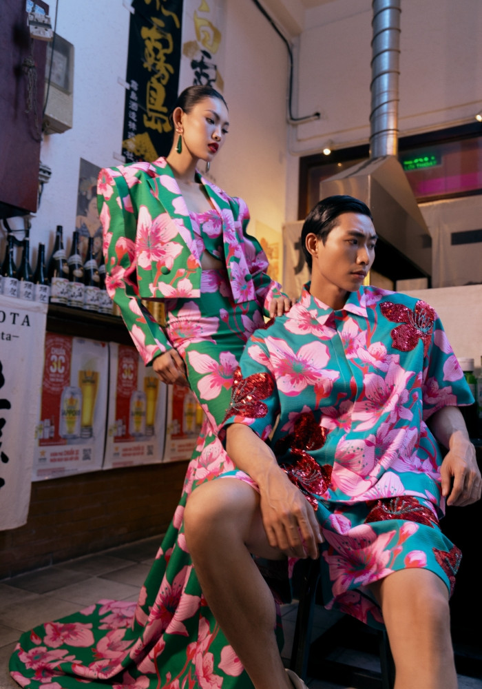 Các thiết kế mang đậm chất mùa lễ hội được pha phối qua bảng màu mùa xuân như hồng fuchsia, xanh coban, xanh lá, đỏ… trên các họa tiết hoa mai hoa đào được cách điệu rực rỡ.