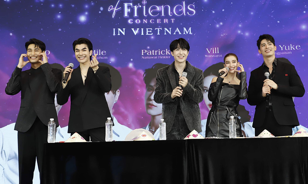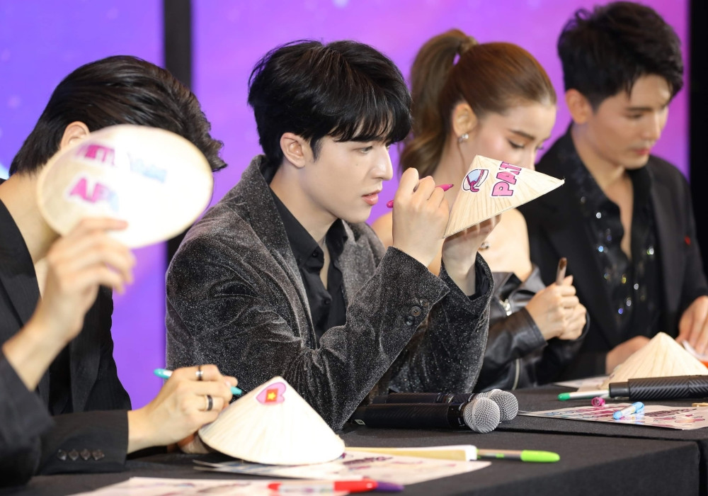 Patrick và các nghệ sĩ ký lên nón lá, quạt giấy xinh xắn là những món quà mà fan Việt dành tặng. Vừa đáp xuống sân bay và chỉ kịp nghỉ ngơi vài giờ đồng hồ, dàn nghệ sĩ xứ Chùa Vàng đã có mặt tại sự kiện. Họ rạng rỡ, thân thiện giao lưu cùng mọi người và trả lời các câu hỏi từ MC. Apo Nattawin bày tỏ bất ngờ vì không nghĩ có lượng fan lớn tại Việt Nam. Sau thành công của phim 'KinnPorsche the series', mỹ nam sinh năm 1994 được các nhãn hàng săn đón với giá cát-sê cao. Mile là cái tên quen thuộc ở dòng phim đam mỹ. Anh hiện là cái tên triển vọng của màn ảnh và là một trong những tài tử có gia thế giàu có, quyền lực bậc nhất Thái Lan. Vill Wannarot - 'Nàng thơ của màn ảnh Thái Lan' là bóng hồng duy nhất trong sự kiện. Cô tạo ấn tượng với fan nhờ tài ăn nói duyên dáng, hài hước khi tiết lộ mình rất thích món ăn của Việt Nam. Son Yuke là tài tử thuộc thế hệ 8x. Anh có nhiều vai diễn ghi đậm dấu ấn với khán giả châu Á. Nam diễn viên kín tiếng đời tư, bày tỏ mong muốn khán giả hãy tập trung vào hoạt động nghệ thuật của mình. Vill Wannarot và Son Yuke từng tạo tiếng vang khi đóng cặp trong các dự án phim như: 'Nhân duyên tiền định', 'Hoàng tử ếch' phiên bản Thái Lan.... Đây là lần đầu tiên họ đặt chân đến đất nước hình chữ S. Concert sẽ diễn ra vào lúc 19h00 ngày 10/9 tại TP. Thủ Đức, TP.HCM. Ban tổ chức cho biết một phần doanh thu từ việc bán vé sẽ được trích làm từ thiện, bao gồm trao quà và cơ sở vật chất tại Làng thiếu niên Thủ Đức.