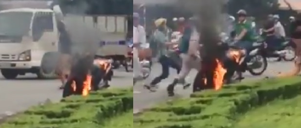 Lúc sau anh này dùng can xăng đổ lên người rồi định nhảy vào chiếc xe máy đang bốc cháy để tự thiêu.