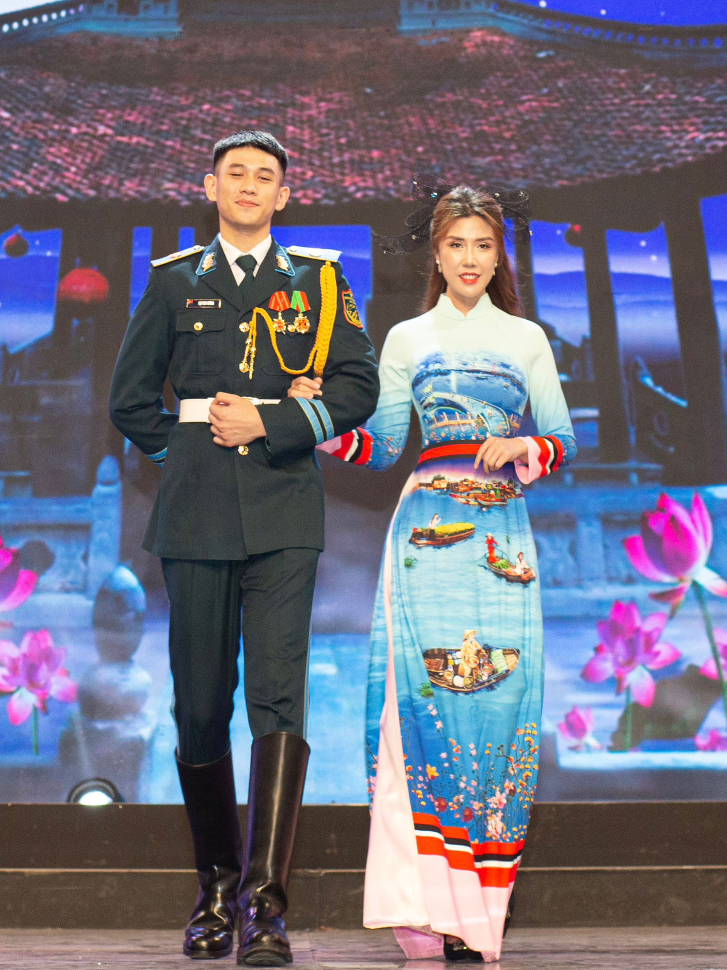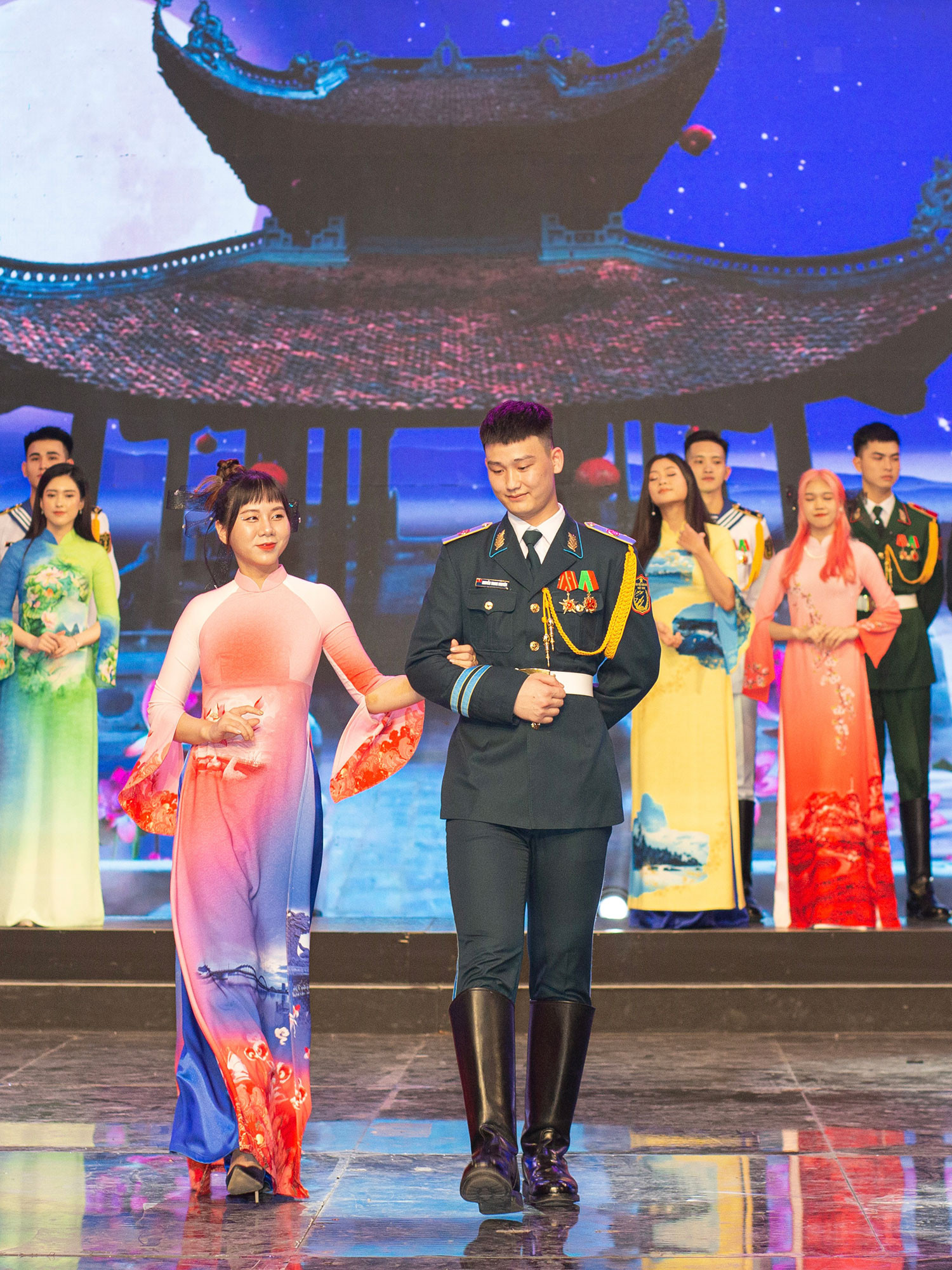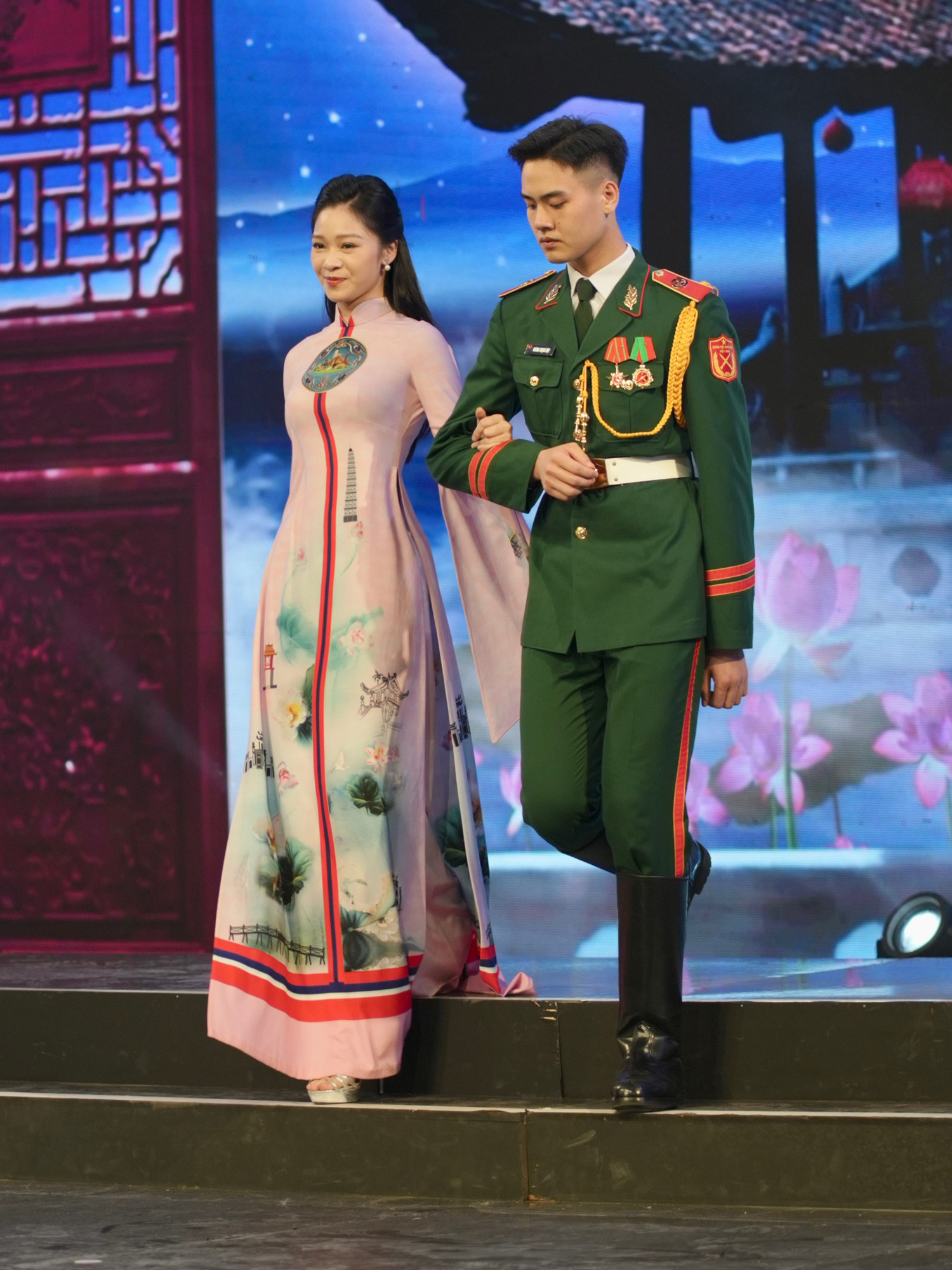15 thí sinh của cuộc thi "Duyên dáng áo dài VTV 2023" cùng các chiến sĩ thuộc Đoàn Nghi lễ Quân đội - Bộ Tổng Tham mưu Quân đội Nhân Dân Việt Nam trình diễn BST "Việt Nam gấm hoa" của NTK Vũ Thảo Giang.