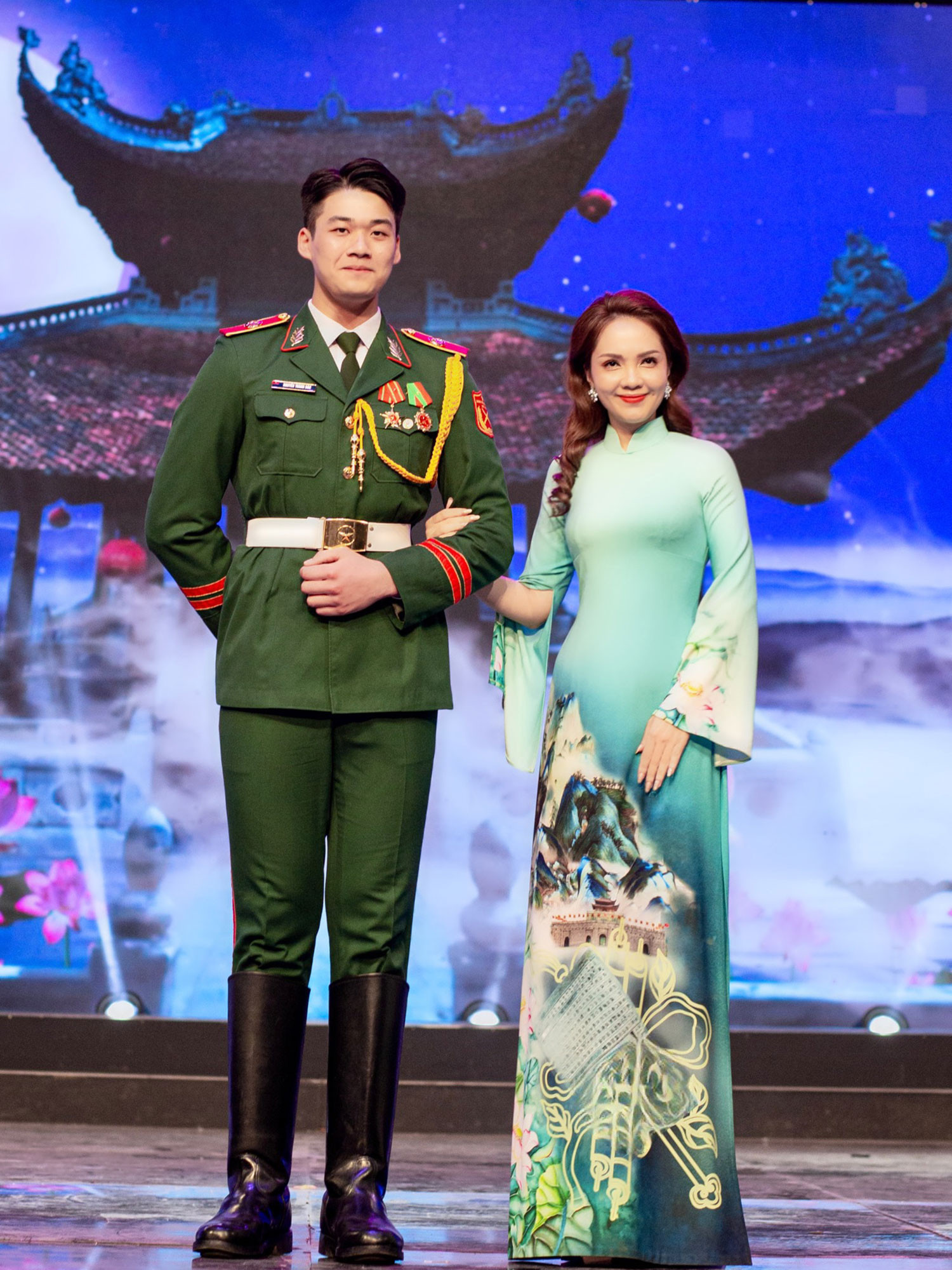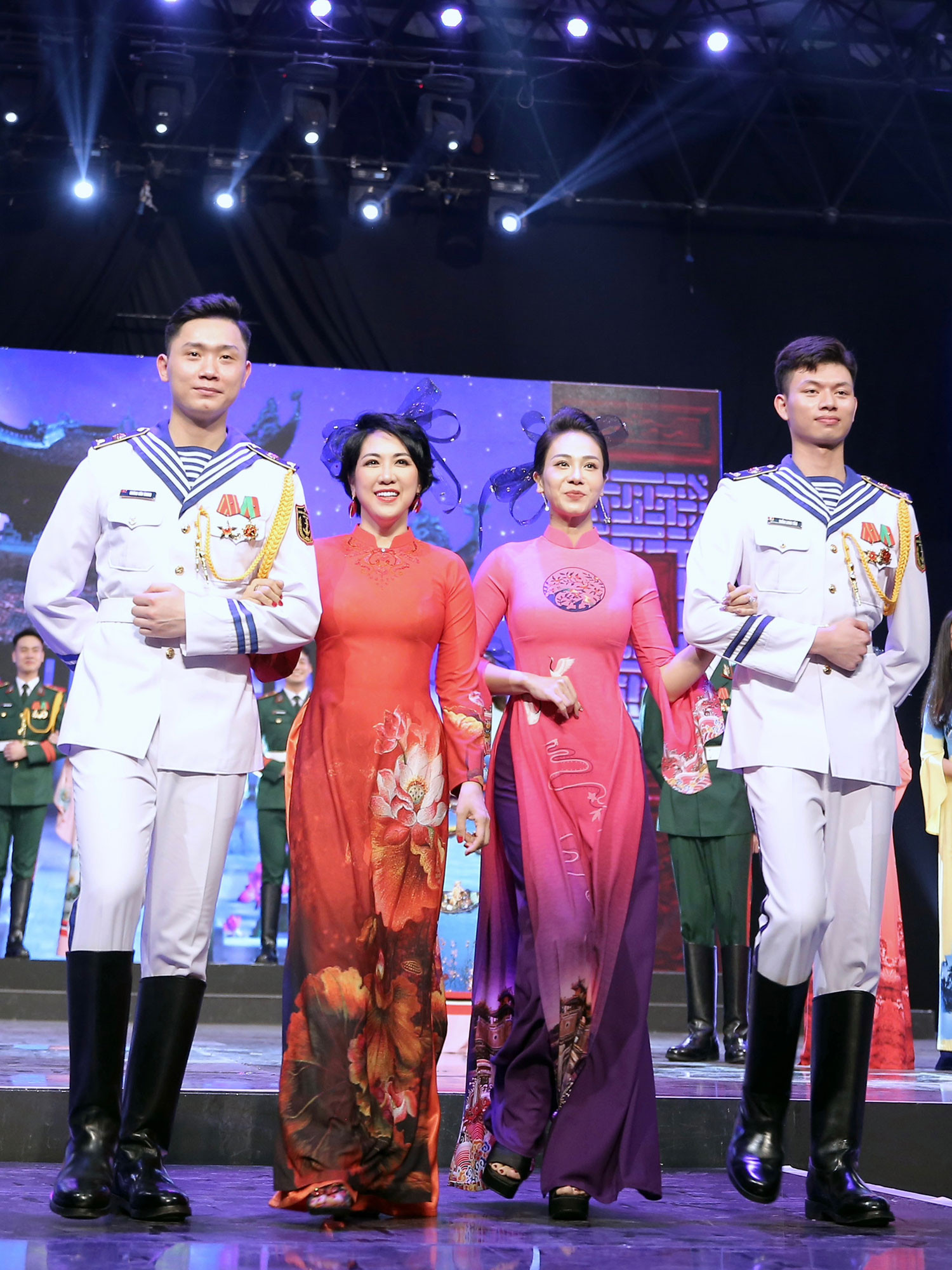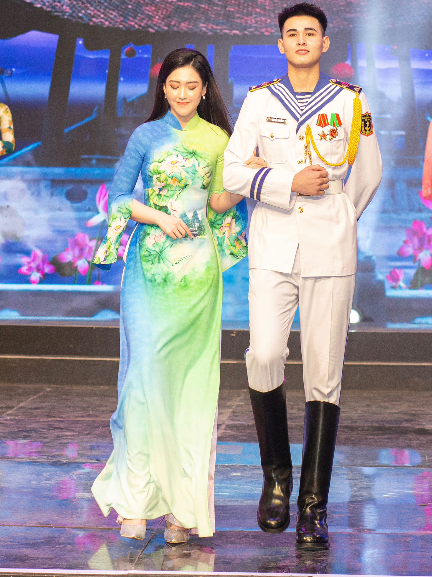 15 thí sinh của cuộc thi "Duyên dáng áo dài VTV 2023" cùng các chiến sĩ thuộc Đoàn Nghi lễ Quân đội - Bộ Tổng Tham mưu Quân đội Nhân Dân Việt Nam trình diễn BST "Việt Nam gấm hoa" của NTK Vũ Thảo Giang.