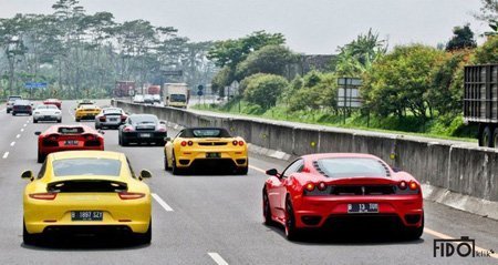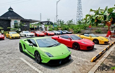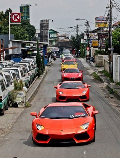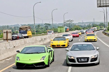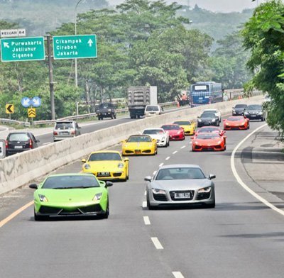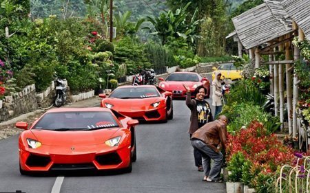 Những chiếc siêu xe đủ màu sắc, từ đỏ, vàng đến xanh cốm, đã tạo điểm nhấn cho đường phố Bandung, thành phố được bao quanh bởi những ngọn núi lửa.