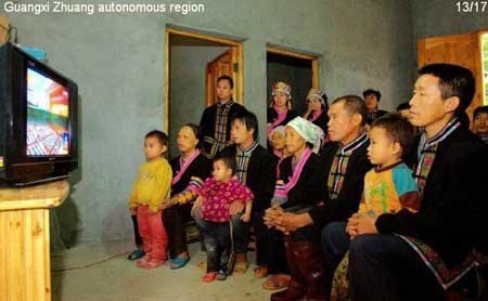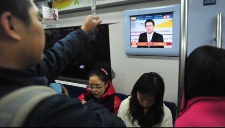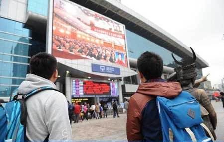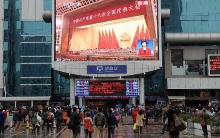 Hành khách theo dõi tường thuật trực tiếp trên truyền hình về lễ khai mạc Đại hội đại biểu toàn quốc lần thứ 18 của đảng Cộng sản Trung Quốc tại ga xe lửa ở Quý Dương, thủ phủ tỉnh Quý Châu, tây nam Trung Quốc hôm 8/11/2012.