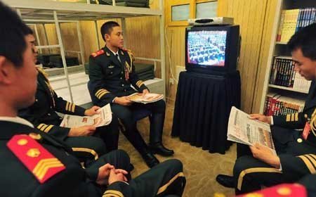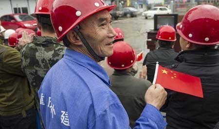 Công nhân xây dựng tại Trùng Khánh, Trung Quốc dành thời gian để theo dõi tin tức về sự kiện trọng đại của đất nước.