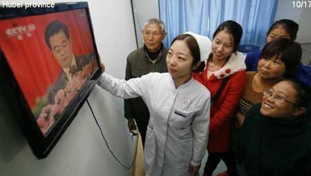 Các nhân viên nhà ga ở thành phố Nam Xương, thủ phủ tỉnh Giang Tây chăm chú theo dõi Đại hội.