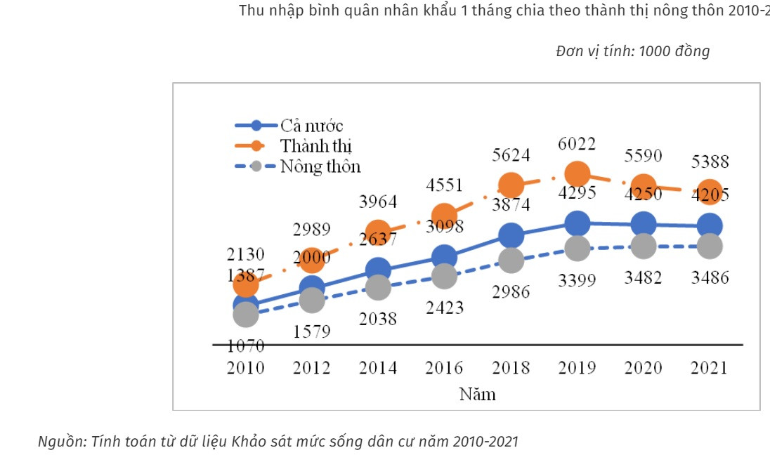 Theo Tổng cục Thống kê, trước năm 2019 thu nhập bình quân đầu người liên tục tăng, tuy nhiên sau 2019 do tác động tiêu cực của đại dịch Covid-19, thu nhập có xu hướng giảm dần. Tốc độ giảm thu nhập ở khu vực thành thị nhiều hơn so với khu vực nông thôn. So với năm 2020, thu nhập bình quân 1 người 1 tháng năm 2021 ở khu vực thành thị giảm 3,6%, trong khi thu nhập bình quân 1 người 1 tháng ở khu vực nông thôn không thay đổi đáng kể.