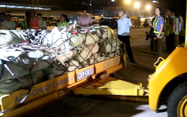 | 40 tấn hàng viện trợ của nước Nga được vận chuyển bằng máy bay cập Cảng hàng không quốc tế Cam Ranh |