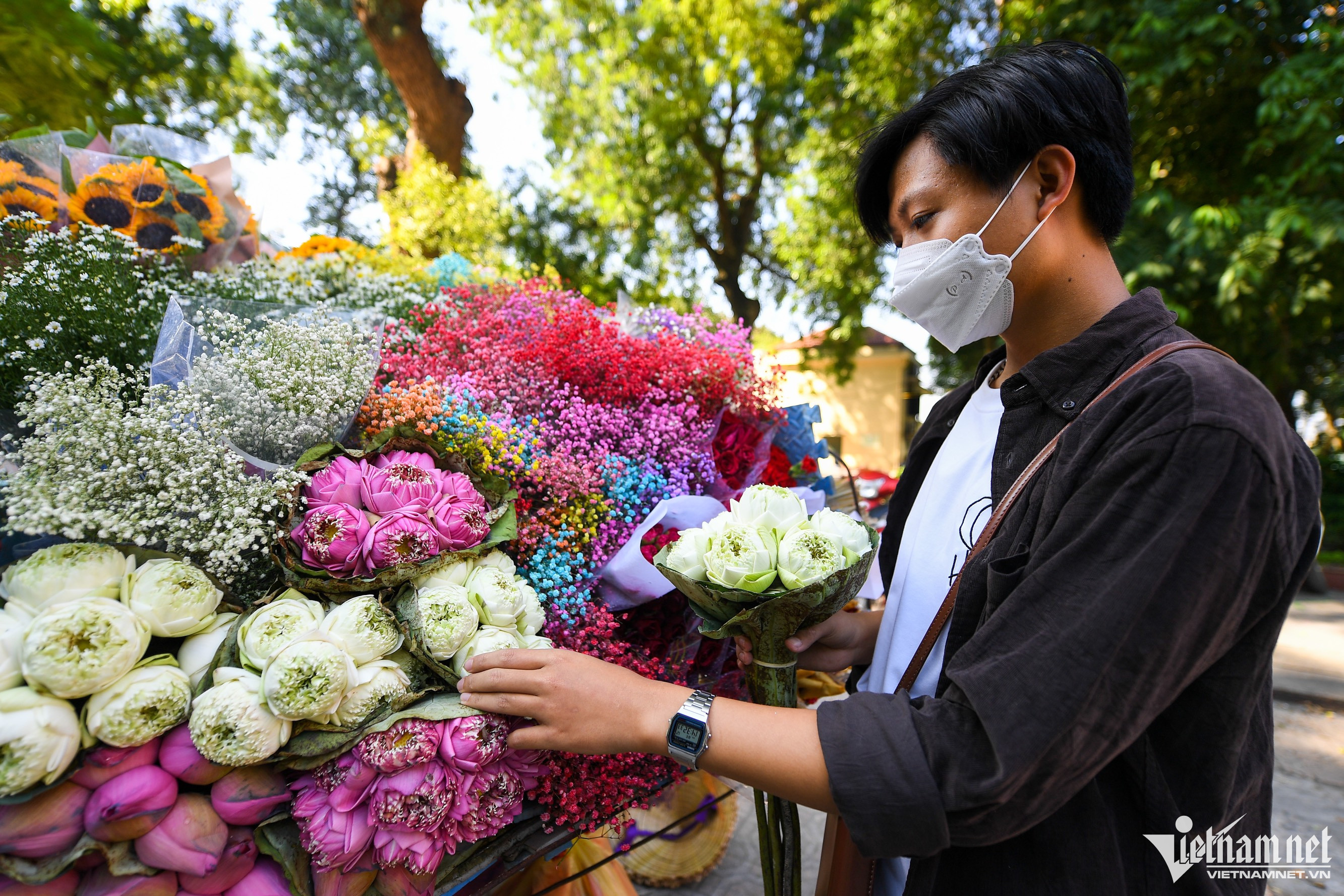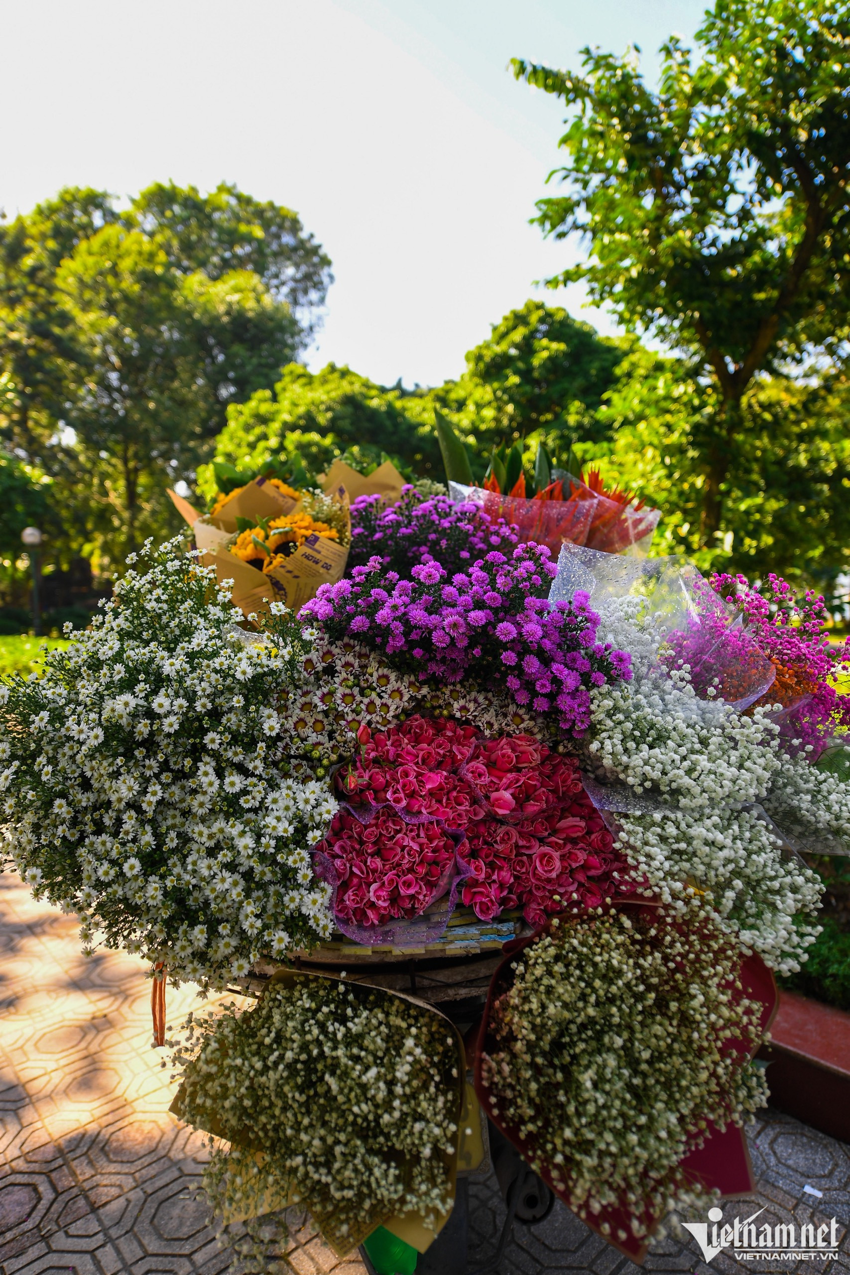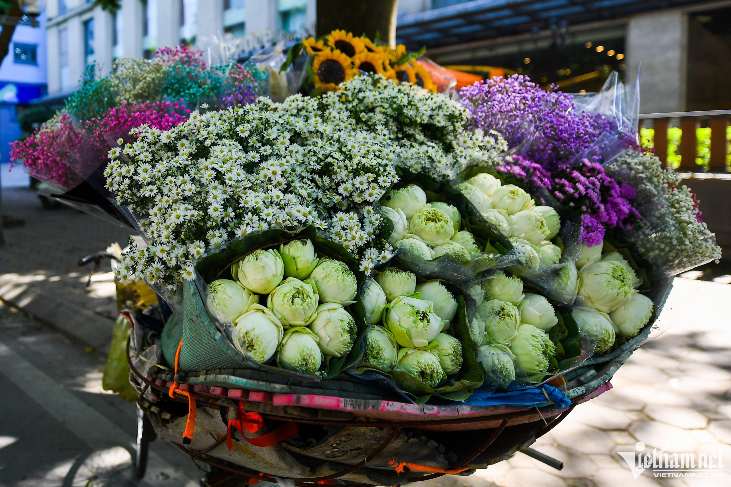 Trên mỗi thúng hoa có nhiều loại khác nhau như sen, cúc hoạ mi, hướng dương.