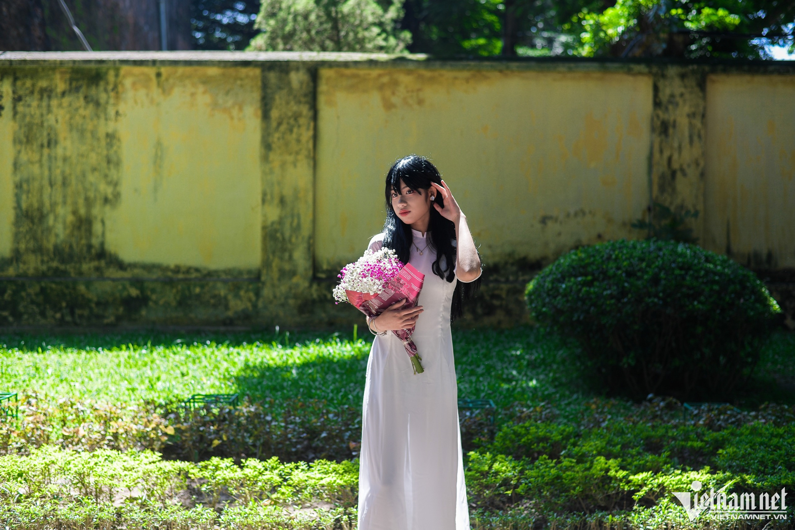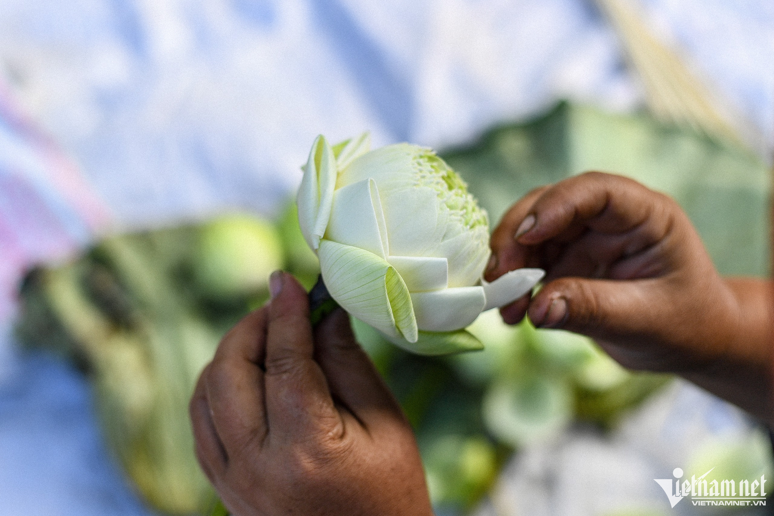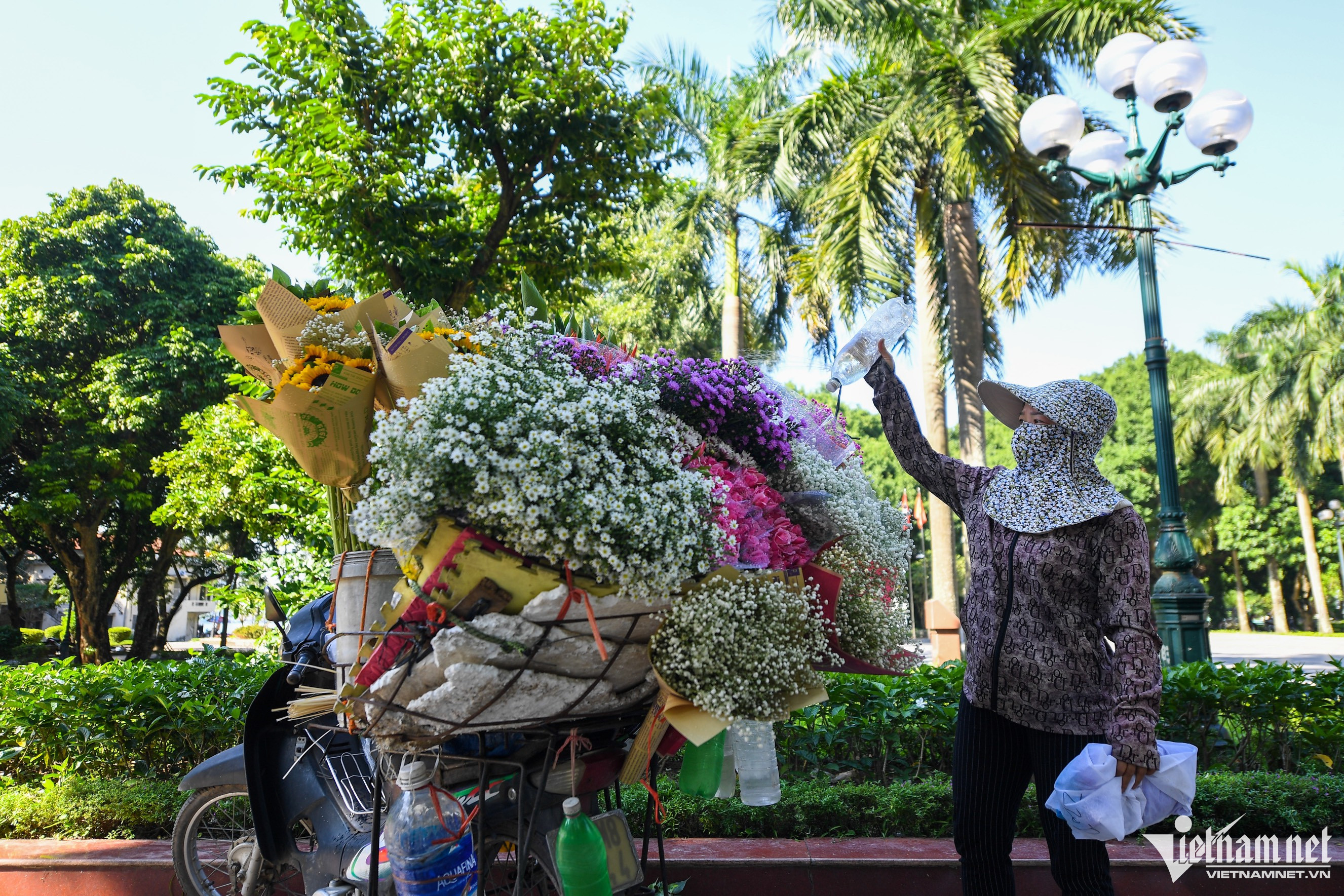 “Vào những tháng cuối năm, hoa bán được nhiều hơn hẳn vì thời điểm này mọi người hay đi chụp ảnh. Lượng hàng lấy vào đợt này cũng cao hơn 1,5 lần so với bình thường”, chị Thơm (chủ xe hoa) nói. Mỗi bó hoa có giá từ 30.000-150.000 đồng thu hút sự quan tâm của người đi đường.Mặc dù đang vào mùa thạch thảo, hướng dương, riêng hoa sen vẫn được nhiều bạn trẻ lựa chọn hơn cả. Người bán hàng đang gấp từng lá cho sen để tạo hình bắt mắt. Kiều Thạch Phong lựa chọn một bó hoa sen với giá 70.000 đồng. “Tranh thủ thời tiết mát mẻ tôi và bạn vừa đi ngồi cà phê rồi mua 1-2 bó hoa để chụp ảnh với nắng vàng mùa thu”, Phong nói.8h sáng, hai bạn trẻ Giang và Tuyết từ thị xã Sơn Tây lên Phan Đình Phùng (hơn 50km) để chụp ảnh hoa với áo dài. “Thời tiết đẹp như thế này mà ở nhà hơi phí, do đó chúng tôi quyết định nghỉ một buổi để đi chơi. Hoa năm nay rất đẹp, chúng tôi mua được 2 bó ưng ý”, Giang chia sẻ.Cô gái tên Phượng chuẩn bị cầu kỳ từ trang phục đến đạo cụ tranh thủ chụp ảnh với ánh nắng vàng nhẹ trên phố. Cặp đôi Quân và Hương cho biết sinh ra và lớn lên tại Hà Nội, do vậy tranh thủ dịp này hai bạn chụp bộ ảnh cùng khung cảnh ở thủ đô với phong cách nhẹ nhàng, đơn giản.