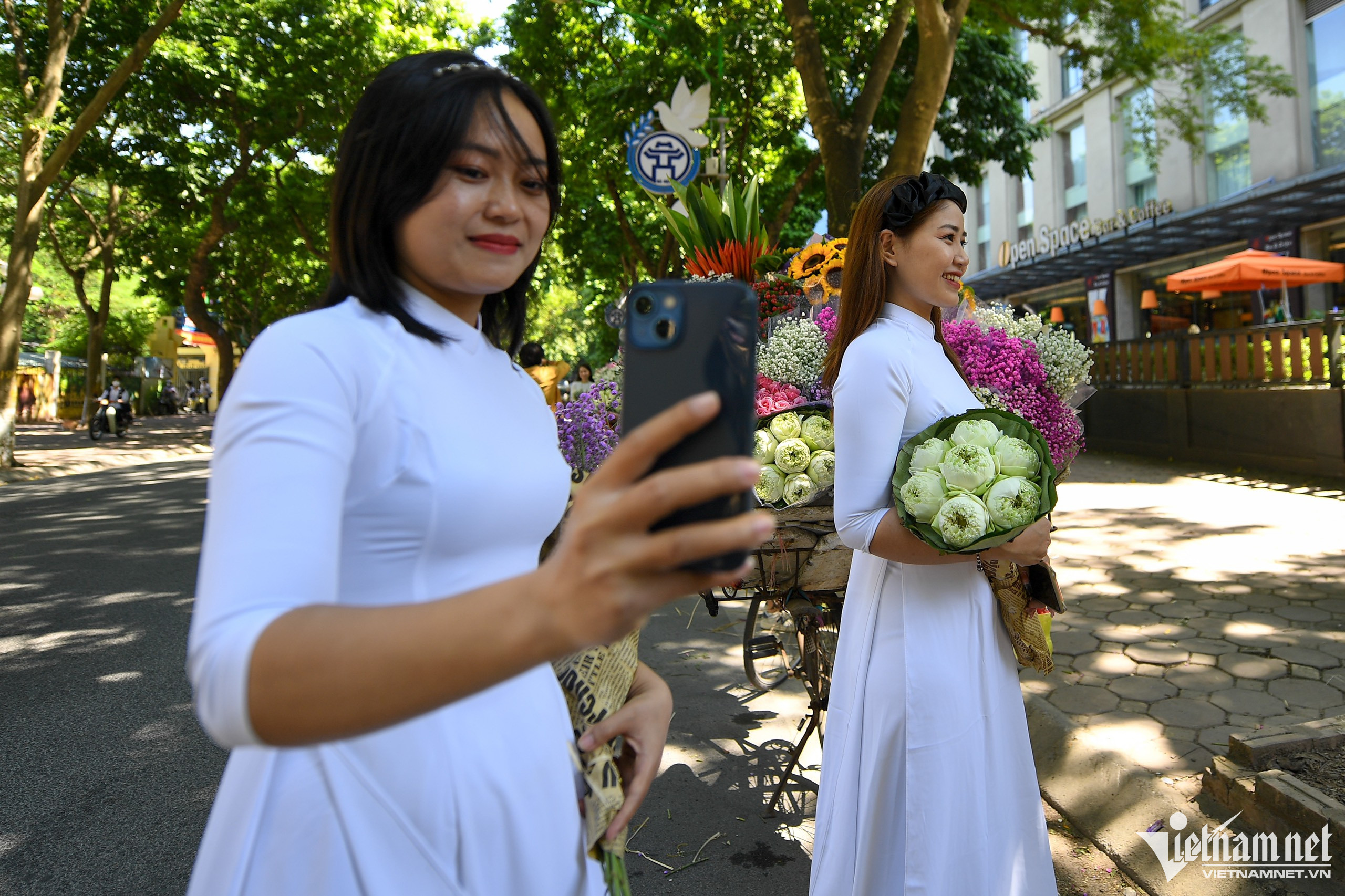 Phố Phan Đình Phùng, Thụy Khuê vào những ngày này nhiều xe đạp chở hoa dựng trải dài hàng chục mét bên lề đường. Nơi đây đang trở thành địa điểm thu hút nhiều bạn trẻ đến chụp ảnh check-in.