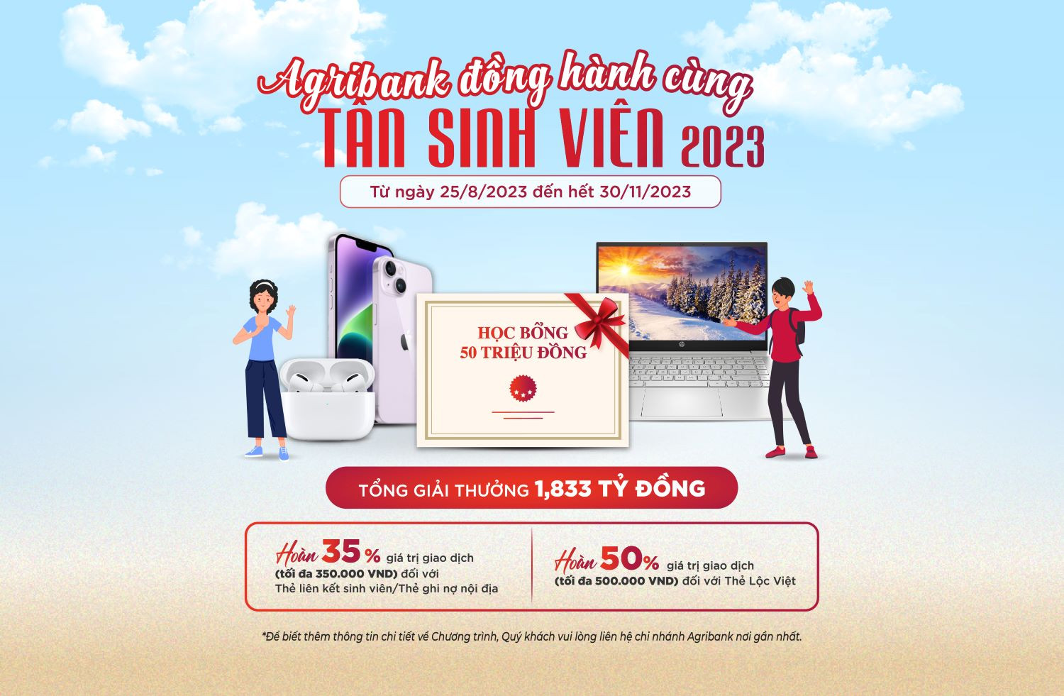 Để chào đón khách hàng là Tân sinh viên năm học 2023-2024 tại các tất cả các trường Đại học, Cao đẳng trên cả nước, Agribank triển khai chương trình khuyến mãi “Agribank đồng hành cùng Tân sinh viên năm 2023” từ ngày 25/8/2023 đến hết 30/11/2023, với 261 giải quay số may mắn tổng giá trị 833.000.000 đồng và hoàn tiền cho khách hàng tổng giá trị 1.000.000.000 đồng.