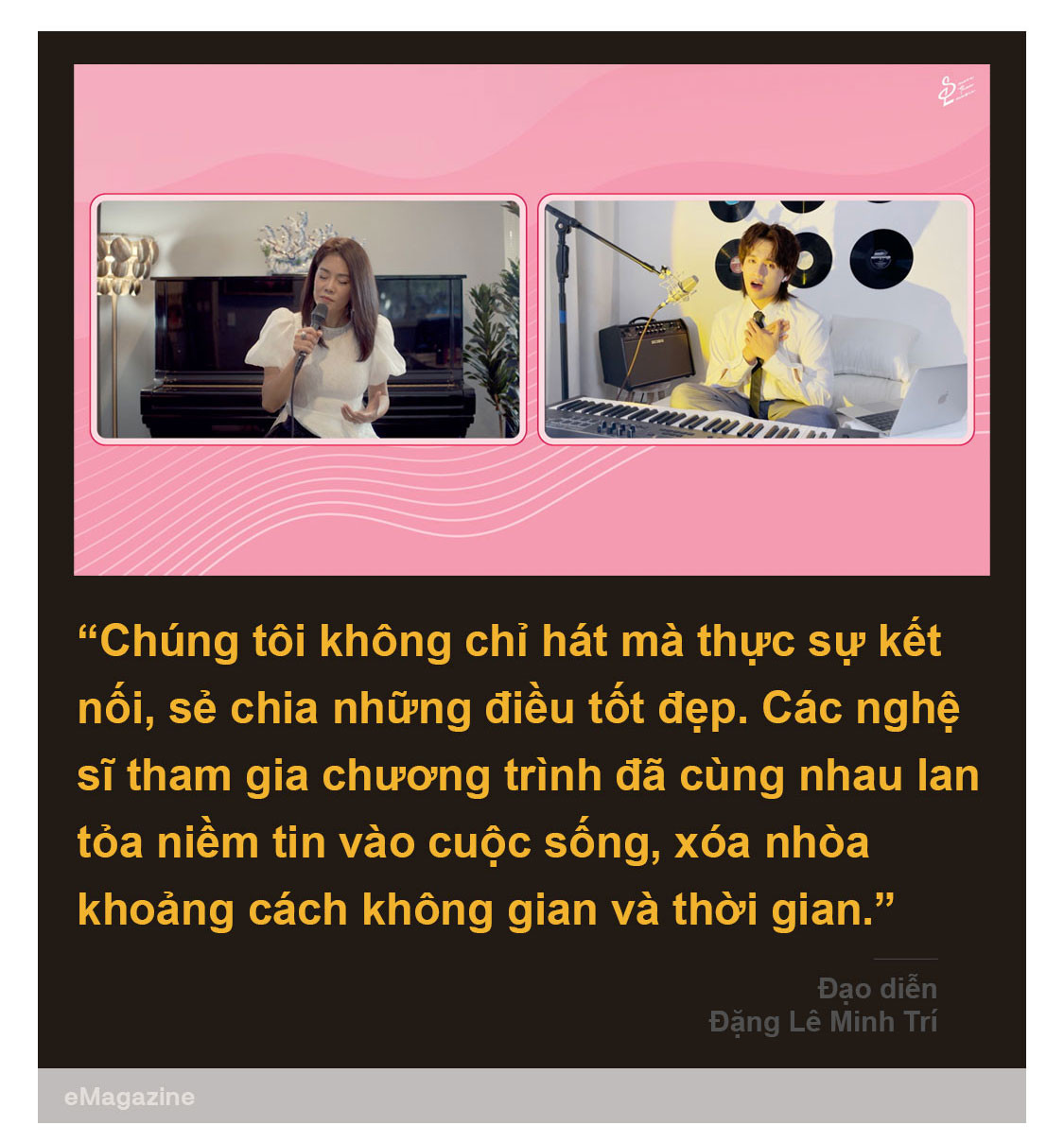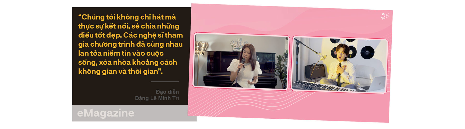 Live band được bố trí cùng kết nối với các ca sĩ từ khắp ba miền Việt Nam và cả ở nước ngoài (ca sĩ Thu Minh ở Singapore, ca sĩ Thu Phương ở Mỹ…). Không chỉ hoà điệu trong âm nhạc, mỗi nghệ sĩ còn kêu gọi đóng góp cho quỹ “San sẻ yêu thương, chung tay vượt qua đại dịch” của Trung tâm Tình nguyện Quốc gia. Toàn bộ số tiền quyên góp từ chương trình được gửi ngay lập tức hỗ trợ người lao động khó khăn trong đại dịch Covid-19, thể hiện tinh thần nhân văn sâu sắc mà Minh Trí và ekip luôn hướng tới.