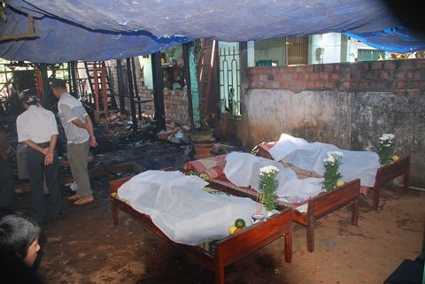 | Thi hài của 3 nạn nhân xấu số được để tạm trong căn nhà cháy |