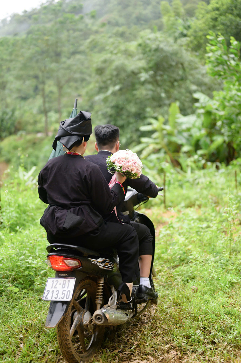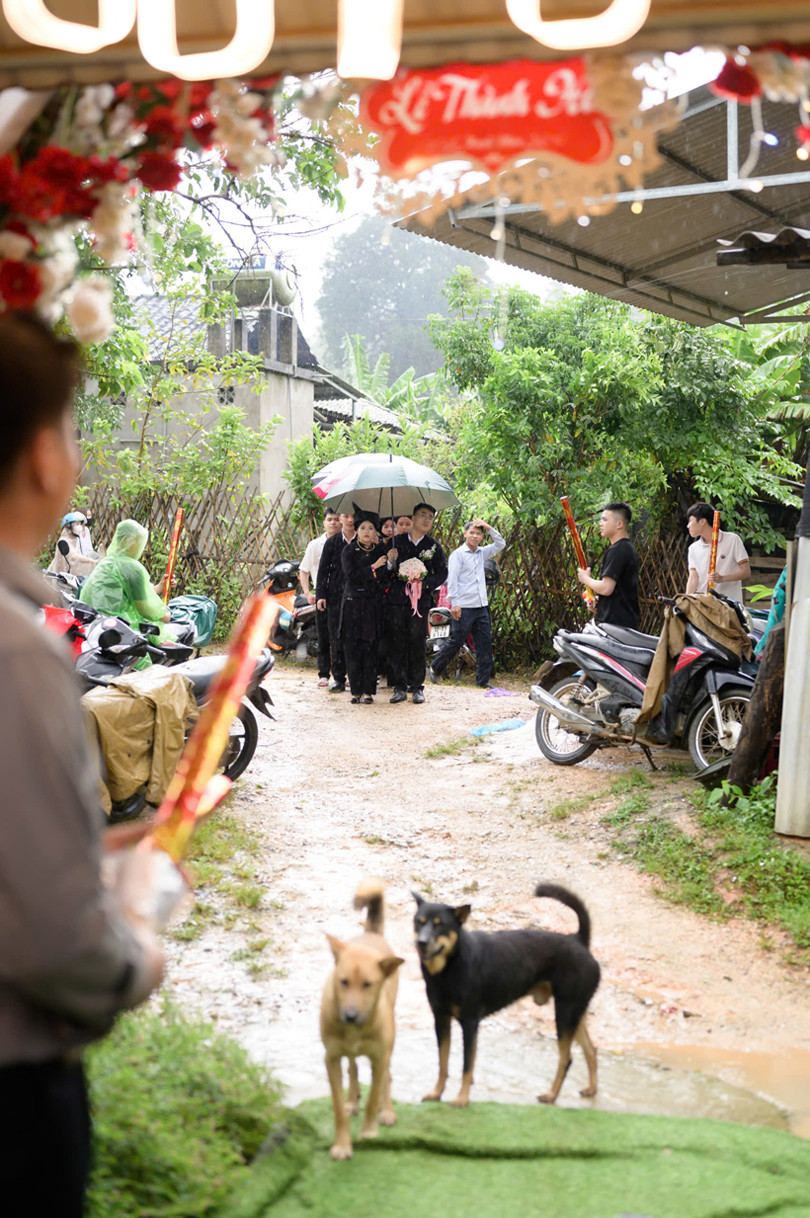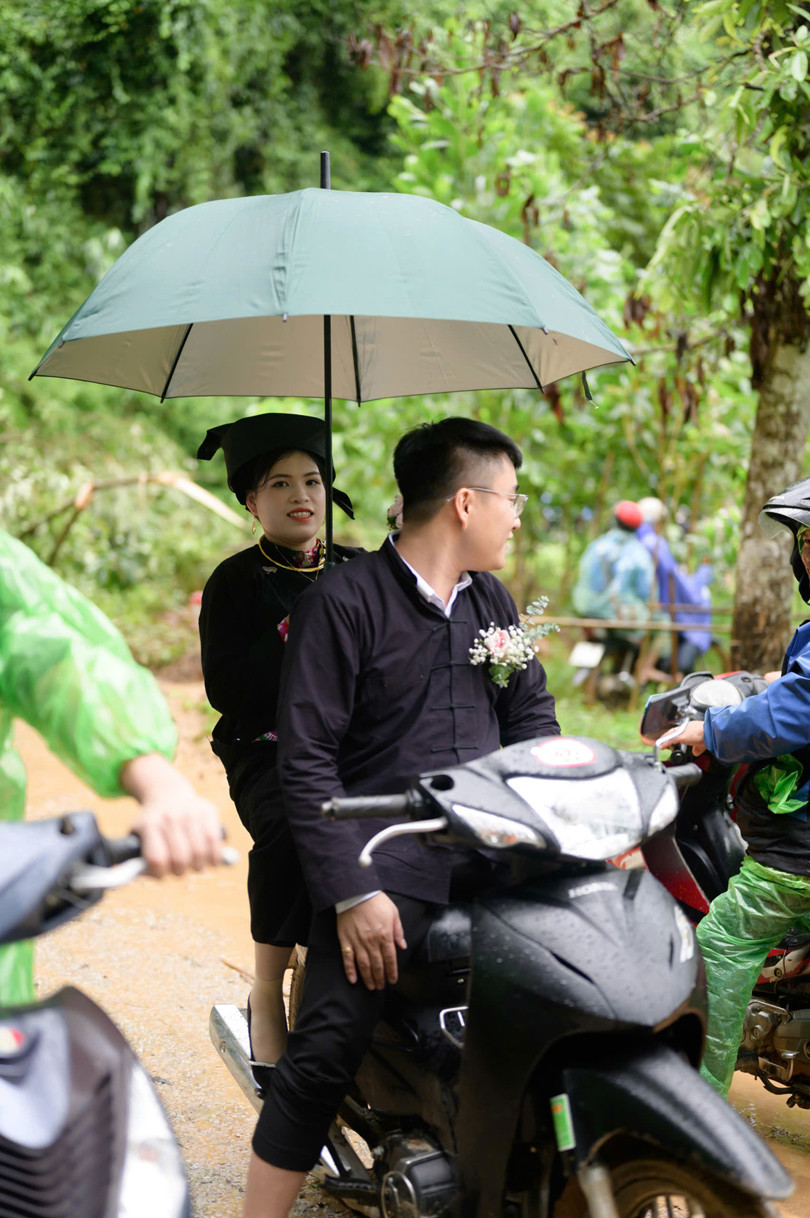 9h sáng, Huy và họ nhà trai có mặt tại nhà gái làm lễ đón dâu. Cô dâu – chú rể thay vì mặc váy cưới trắng, áo vest đen như dự kiến đã chuyển sang mặc trang phục truyền thống của người dân tộc Nùng để tiện cho việc di chuyển ngày mưa bão.