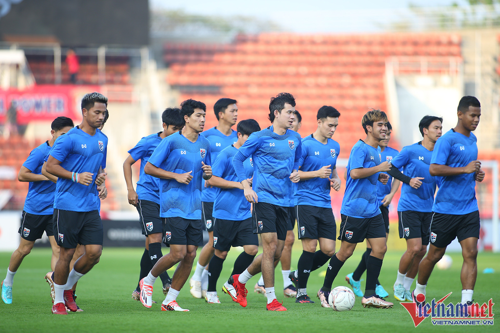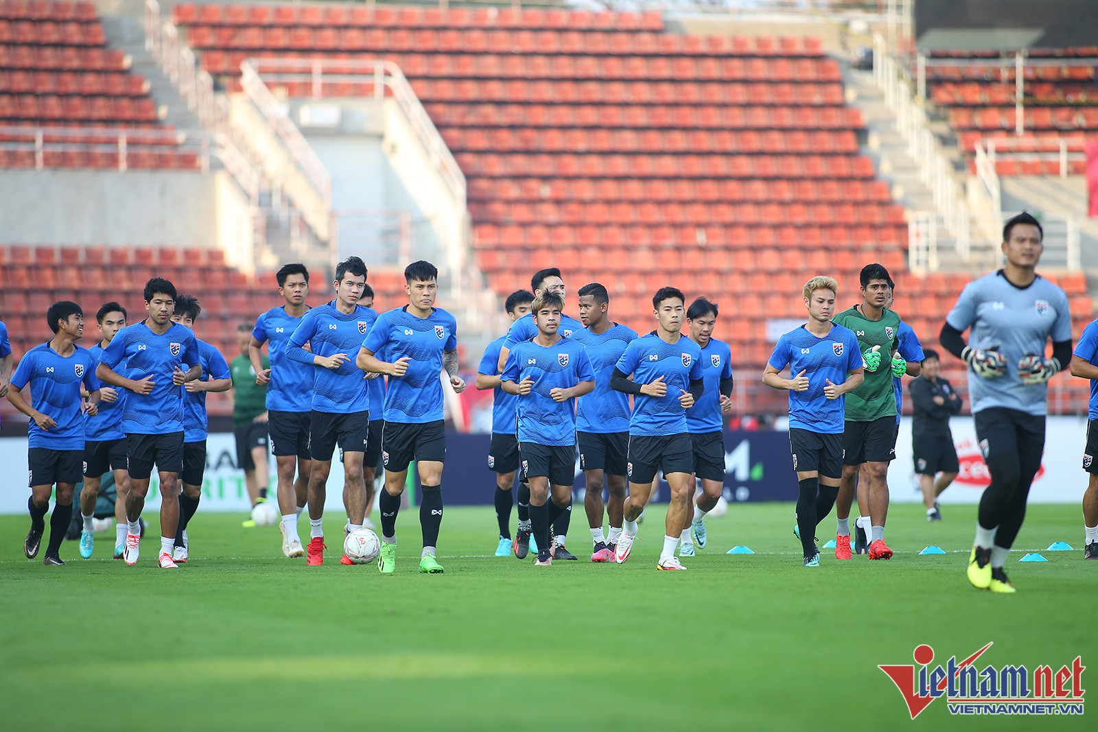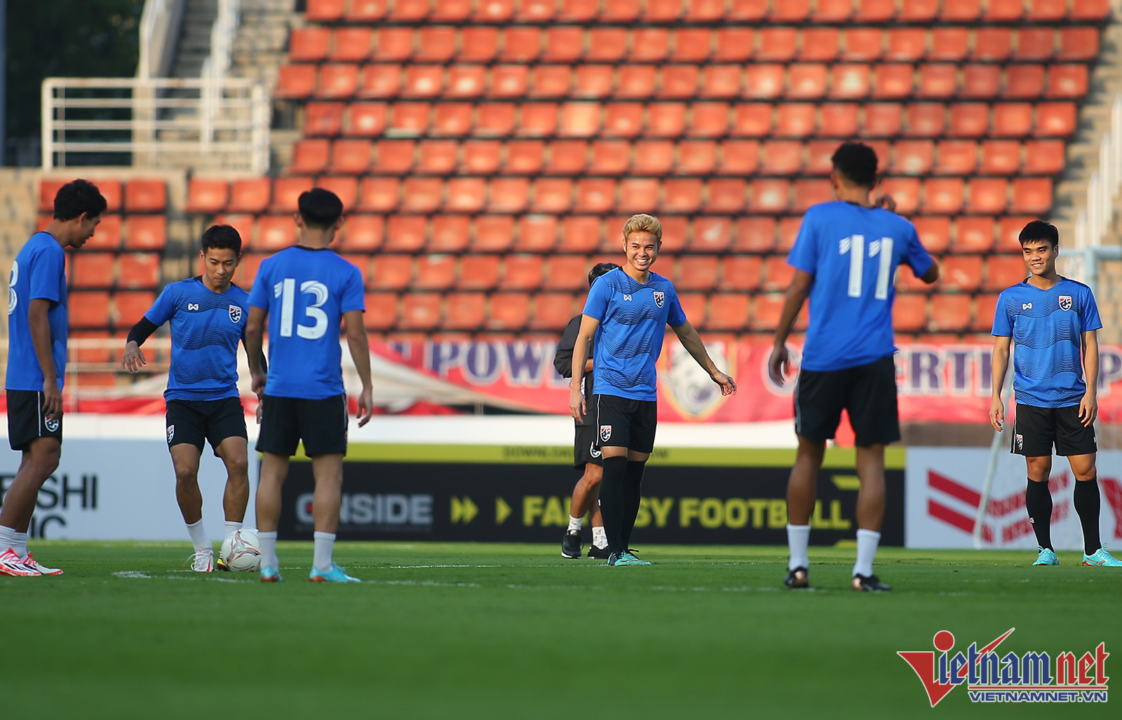 Chiều 15/1, tuyển Thái Lan có buổi tập trên sân Thammsat. Đây là buổi tập duy nhất của "Voi chiến" sau trận chung kết lượt đi tại Mỹ Đình, chuẩn bị cho trận tái đấu Việt Nam.Về sân nhà, các cầu thủ Thái Lan tỏ ra rất hứng khởiCác cầu thủ được thi đấu dưới sự cổ vũ của 25 nghìn khán giả.Theerathon Bunmathan cười rất tươi trong buổi tập."Mục tiêu của Thái Lan đương nhiên là giành chiến thắng ở trận lượt về, qua đó nâng cúp vô địch trên sân nhà", ngôi sao từng thi đấu ở Nhật Bản khẳng định.Các thủ môn tuyển Thái Lan thể hiện sự quyết tâm trước trận đấu.Với kết quả hòa 2-2 trên sân khách, tuyển Thái Lan có lợi thế cho trận lượt về.Dù vậy, HLV Polking của tuyển Thái Lan vẫn tuyên bố đội nhà sẽ chơi tấn công để giành chiến thắng mà không có chủ trương phòng ngự.Tiền đạo chủ lực của Thái Lan là Teerasil Dangda gần như chắc chắn vắng mặt ở trận chung kết lượt về AFF Cup 2022. Buổi sáng, chân sút sinh năm 1988 phải đi chụp cộng hưởng từ, còn buổi chiều anh chỉ có thể đi bộ trên sân cùng bác sĩ.HLV Polking tỏ ra thận trọng khi Thái Lan tiếp tuyển Việt Nam trên sân nhà, lúc 19h30 ngày 16/1, trên SVĐ Thammasat.