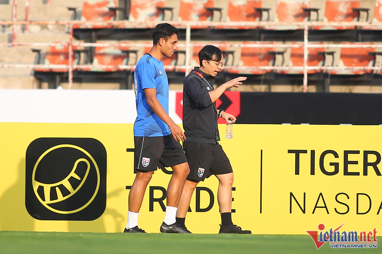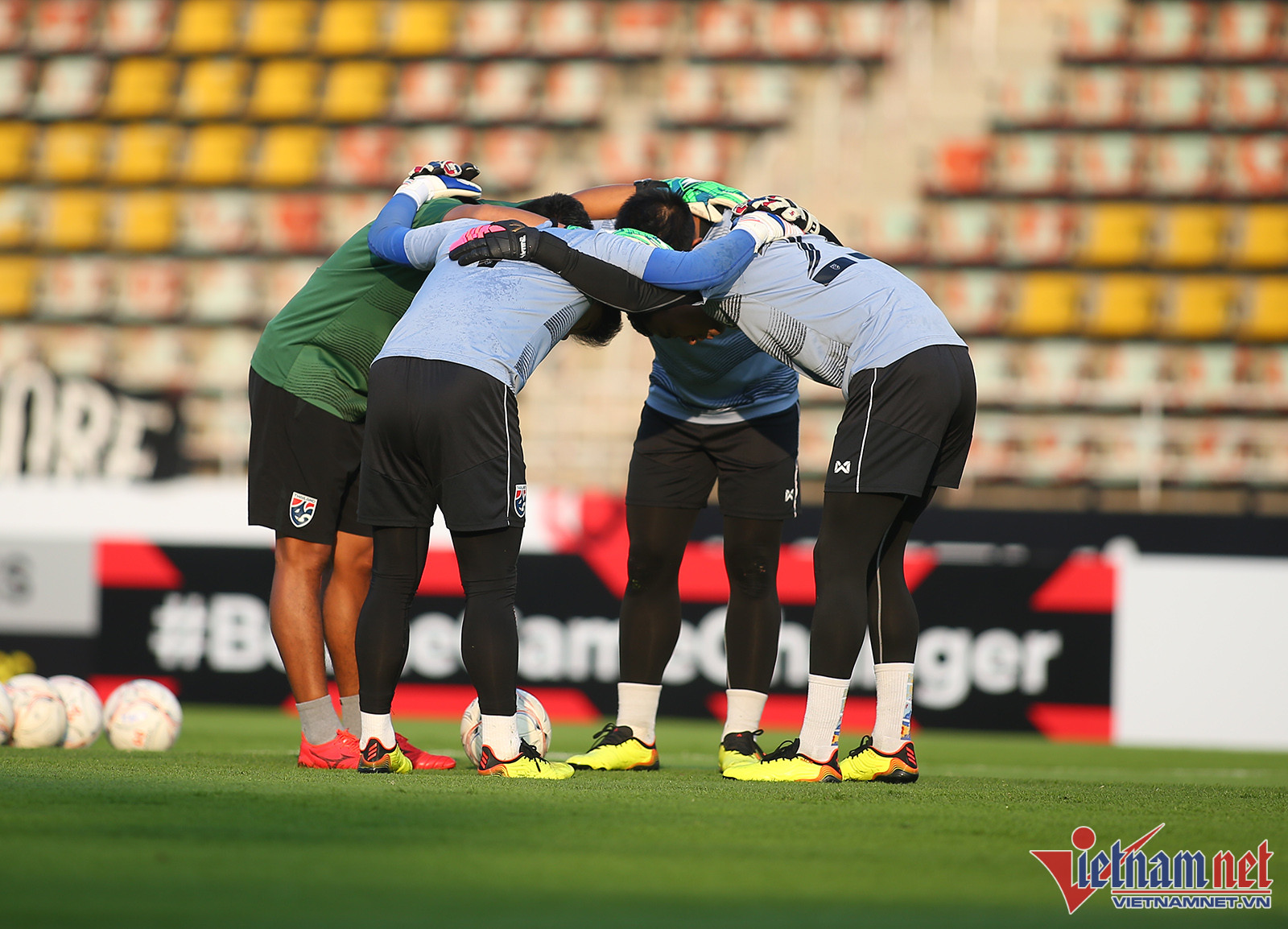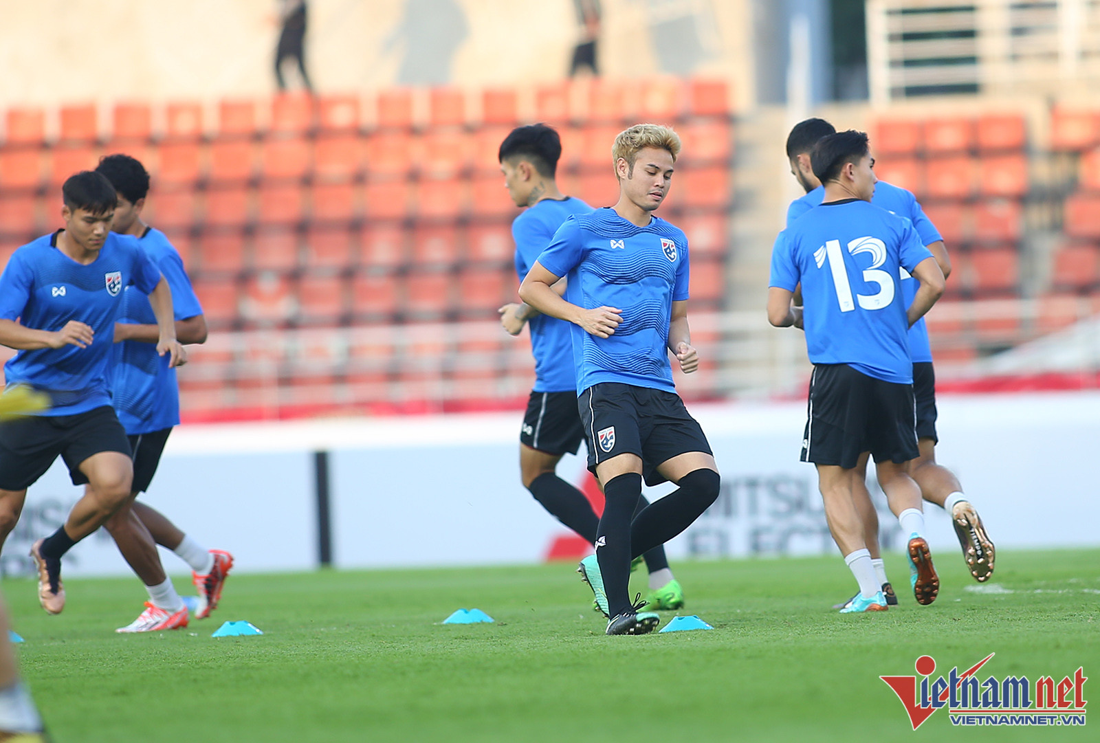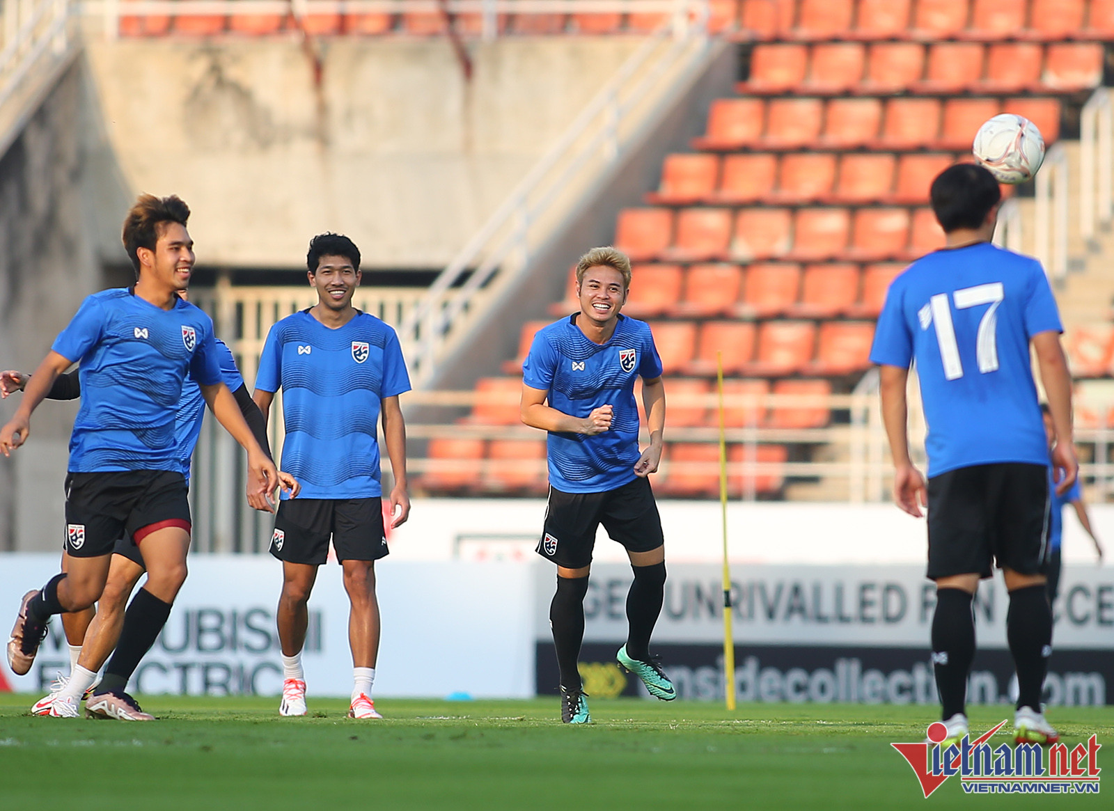 Chiều 15/1, tuyển Thái Lan có buổi tập trên sân Thammsat. Đây là buổi tập duy nhất của "Voi chiến" sau trận chung kết lượt đi tại Mỹ Đình, chuẩn bị cho trận tái đấu Việt Nam.Về sân nhà, các cầu thủ Thái Lan tỏ ra rất hứng khởiCác cầu thủ được thi đấu dưới sự cổ vũ của 25 nghìn khán giả.Theerathon Bunmathan cười rất tươi trong buổi tập."Mục tiêu của Thái Lan đương nhiên là giành chiến thắng ở trận lượt về, qua đó nâng cúp vô địch trên sân nhà", ngôi sao từng thi đấu ở Nhật Bản khẳng định.Các thủ môn tuyển Thái Lan thể hiện sự quyết tâm trước trận đấu.Với kết quả hòa 2-2 trên sân khách, tuyển Thái Lan có lợi thế cho trận lượt về.Dù vậy, HLV Polking của tuyển Thái Lan vẫn tuyên bố đội nhà sẽ chơi tấn công để giành chiến thắng mà không có chủ trương phòng ngự.Tiền đạo chủ lực của Thái Lan là Teerasil Dangda gần như chắc chắn vắng mặt ở trận chung kết lượt về AFF Cup 2022. Buổi sáng, chân sút sinh năm 1988 phải đi chụp cộng hưởng từ, còn buổi chiều anh chỉ có thể đi bộ trên sân cùng bác sĩ.HLV Polking tỏ ra thận trọng khi Thái Lan tiếp tuyển Việt Nam trên sân nhà, lúc 19h30 ngày 16/1, trên SVĐ Thammasat.