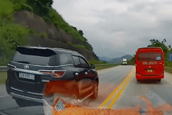 Quá trình vượt ẩu, ô tô con gặp một xe container lưu thông ở hướng ngược lại. Tài xế xe container phải giảm tốc độ, đánh lái lấn vào làn dừng khẩn cấp để tránh va chạm.