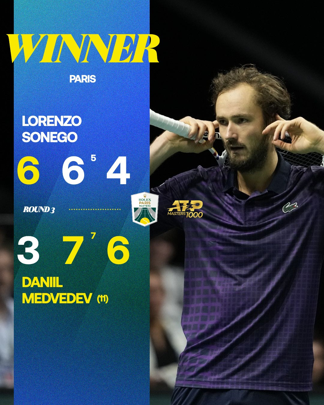 Tại vòng 3 Paris Masters, Daniil Medvedev đối mặt thử thách thực sự mang tên Lorenzo Sonego. Tay vợt người Nga khởi đầu chệch choạc, để thua 3-6 trong set mở màn trước sự kiên cường và quyết đoán từ đối thủ người Ý.