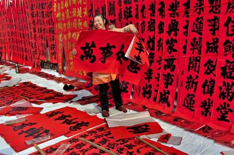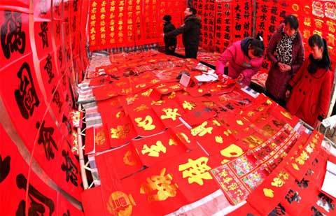 Mua tranh chữ treo Tết ở quận Lushi, tỉnh Hà Nam miền trung Trung Quốc. Ảnh chụp 23/1