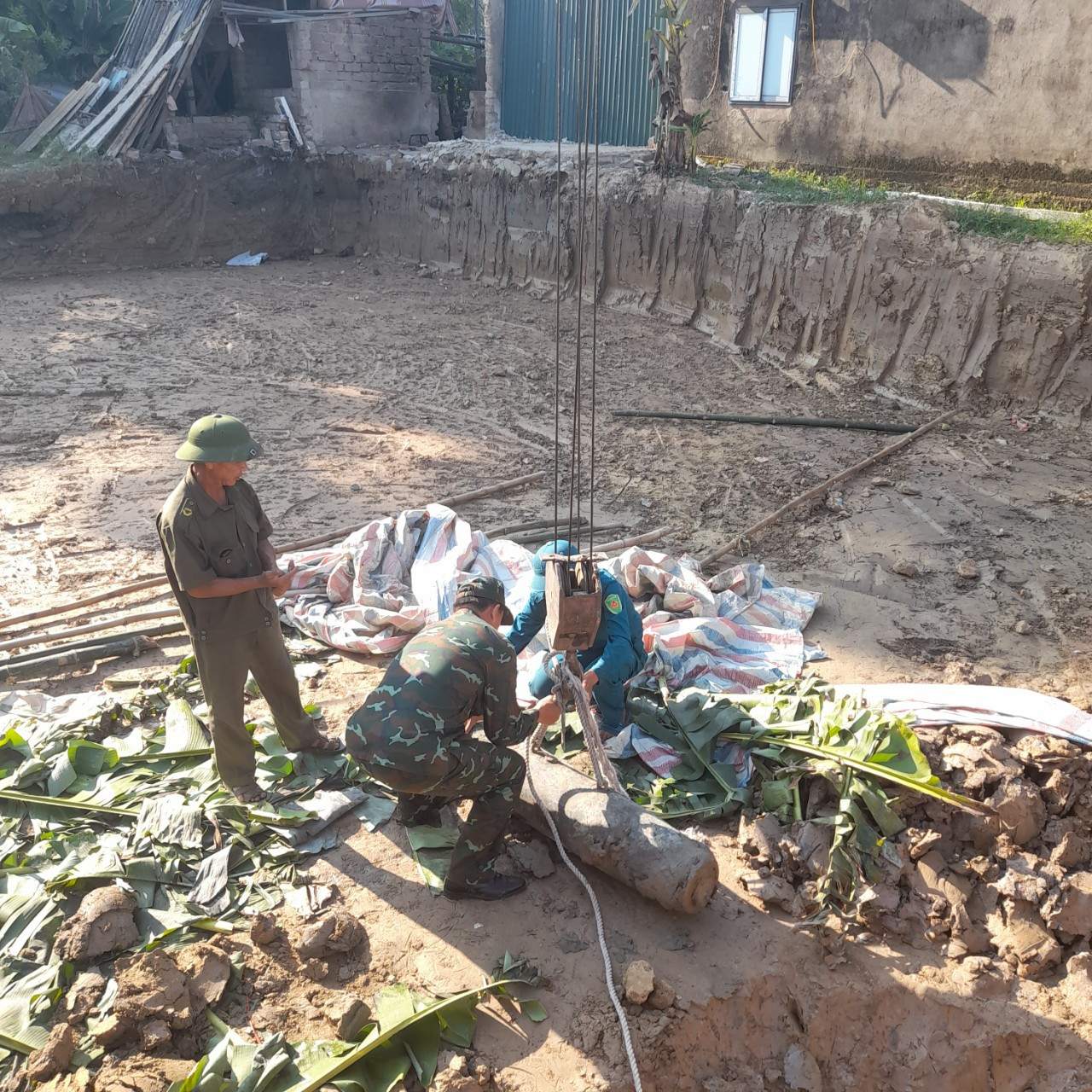 Trước đó, khoảng 7h sáng 25/5, trong quá trình đào móng để xây nhà, gia đình ông Lê Khắc L. (trú thôn Hưng Lộc, xã Cẩm Hưng, huyện Cẩm Xuyên) phát hiện quả bom ở độ sâu 3m nên đã trình báo cơ quan chức năng.