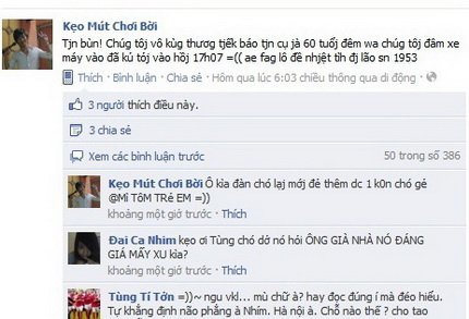 Đoạn status được 'tạm dịch' theo ngôn ngữ chuẩn với nội dung: “Tin buồn! Chúng tôi vô cùng thương tiếc báo tin cụ già 60 tuổi đêm qua chúng tôi đâm xe máy vào đã củ tỏi vào hồi 17 giờ 07…anh em phang lô đề nhiệt tình đi, lão sinh năm 1953.”