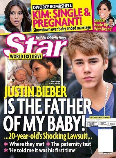 Theo tờ Ione, cả thế giới không biết nên cám ơn hay thù ghét tạp chí Star khi công khai chuyện Justin Bieber đang bị cáo buộc là cha của một nhóc tì 3 tháng tuổi và mẹ của bé tên là Mariah Yeater, 20 tuổi. Theo Yeater, cô và Justin đã quan hệ với nhau trong một phòng tắm sau hậu trường buổi hòa nhạc ở trung tâm Staples, Los Angeles vào tháng 10/2011.