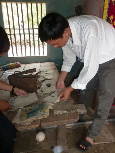 Những người đào móng đã bật nắp thùng đạn, bên trong chứa nhiều hiện vật thời chiến tranh chống Mỹ gồm hai lá cờ, trong đó có 1 lá cờ Mặt trận dân tộc giải phóng miền Nam.Ngoài hai lá cờ ra, trong thùng còn nhiều hiện vật, thư từ, danh sách những người tham gia cách mạng tại địa phương cùng một tập thơ dài ghi là thơ của Hồ Chủ Tịch.