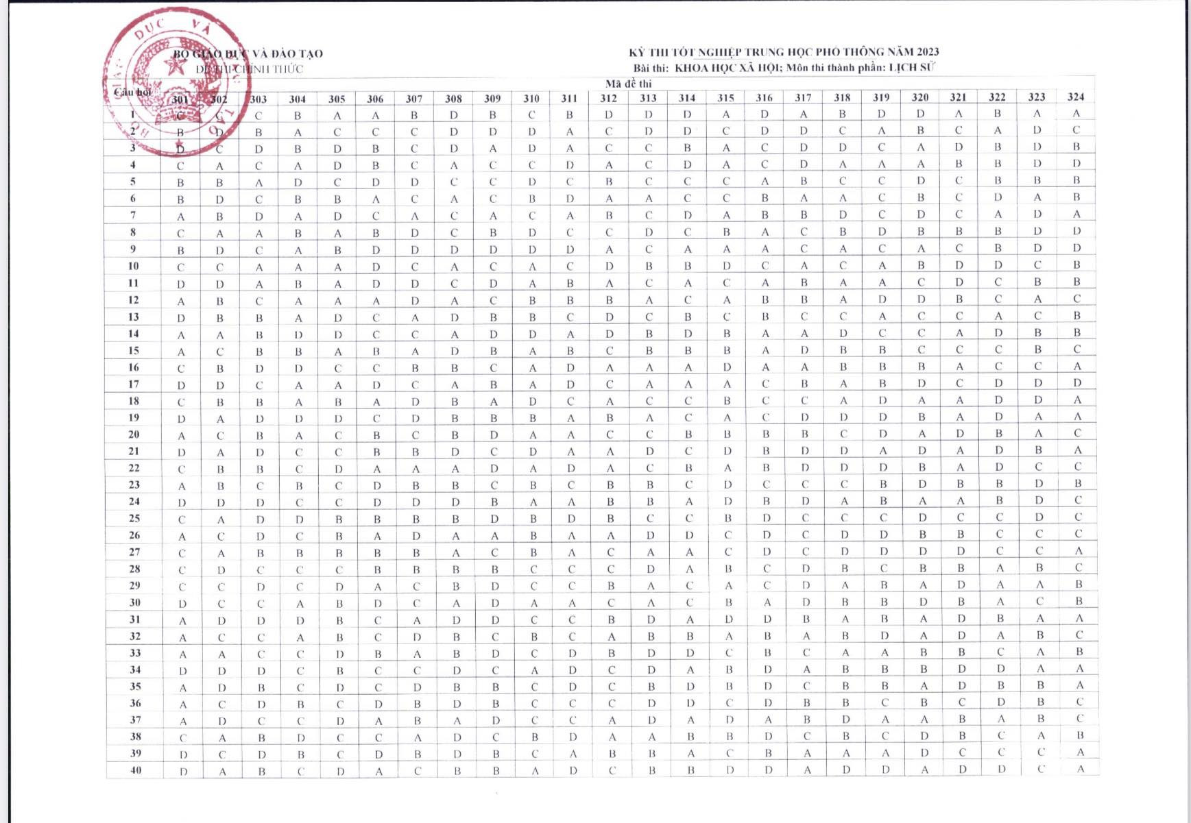 Sau đây là đáp án chính thức môn Lịch sử thi tốt nghiệp THPT năm 2023 của Bộ GD-ĐT: