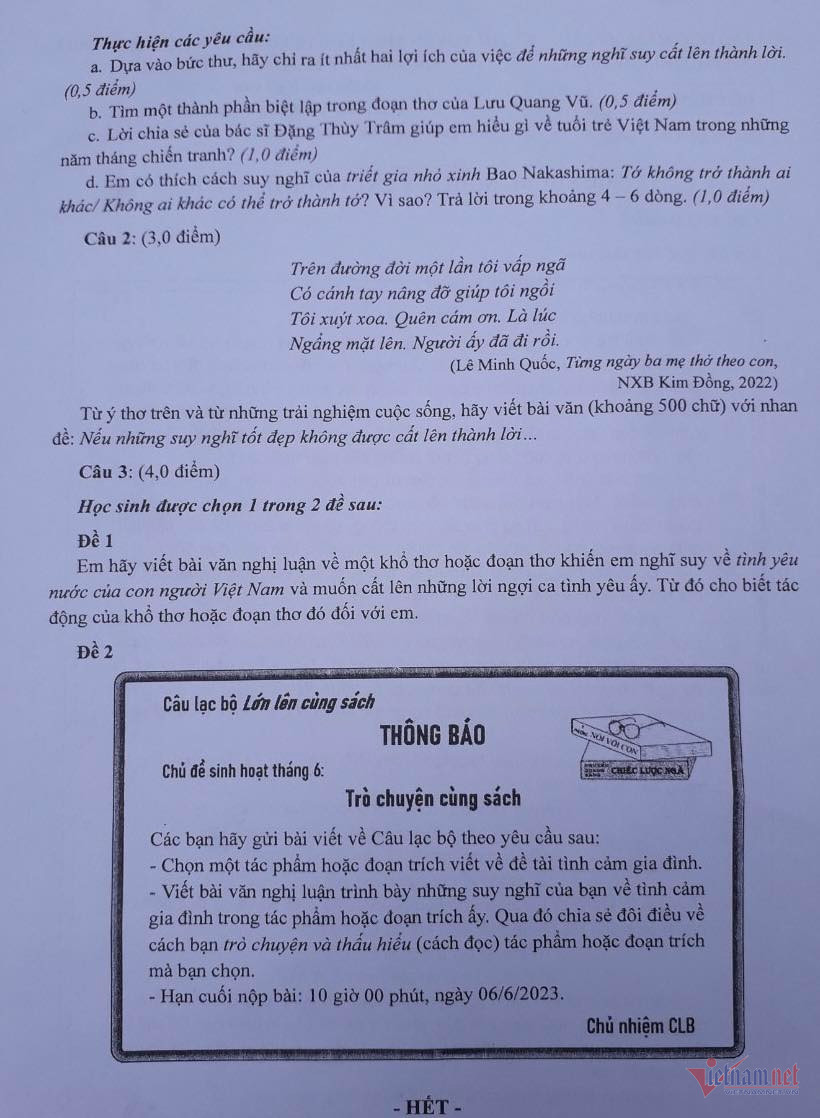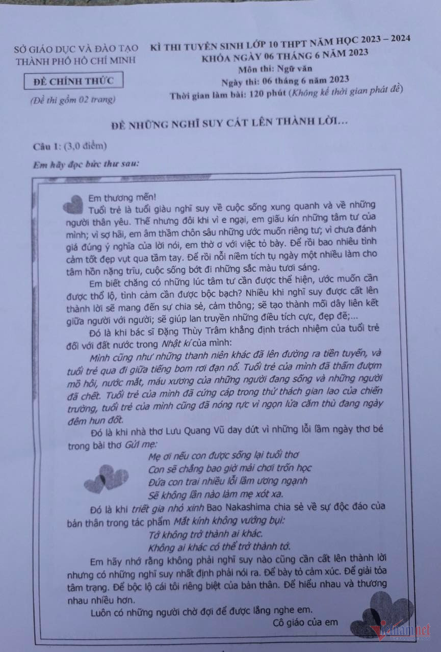 Đề thi môn Ngữ văn vào lớp 10 của TP.HCM như sau: