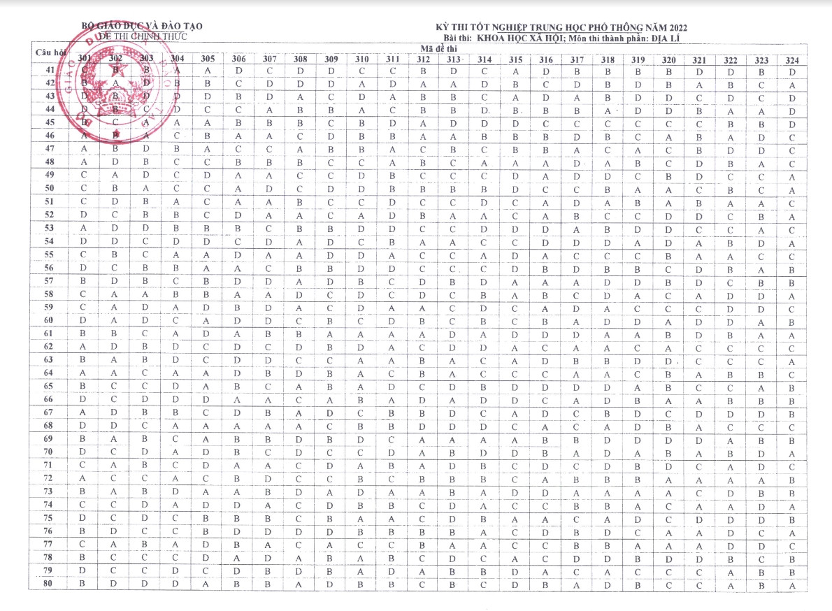 Sau đây là đáp án chính thức môn Địa lý thi tốt nghiệp THPT năm 2022 của Bộ GD-ĐT.