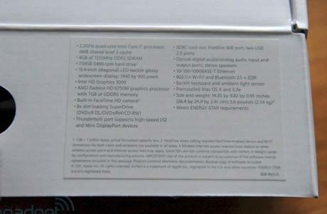 Phiên bản được giới thiệu dưới đây là model MacBook Pro 15 inch với giá 2.199 USD trang bị cấu hình chip 4 nhân Core i7 tốc độ 2,2 GHz, card đồ họa AMD Radeon HD 6750M, 4GB RAM và ổ cứng dung lượng 750GB. Phiên bản này được Engadget thử nghiệm và đạt 9.647 điểm với chương trình GeekBench.