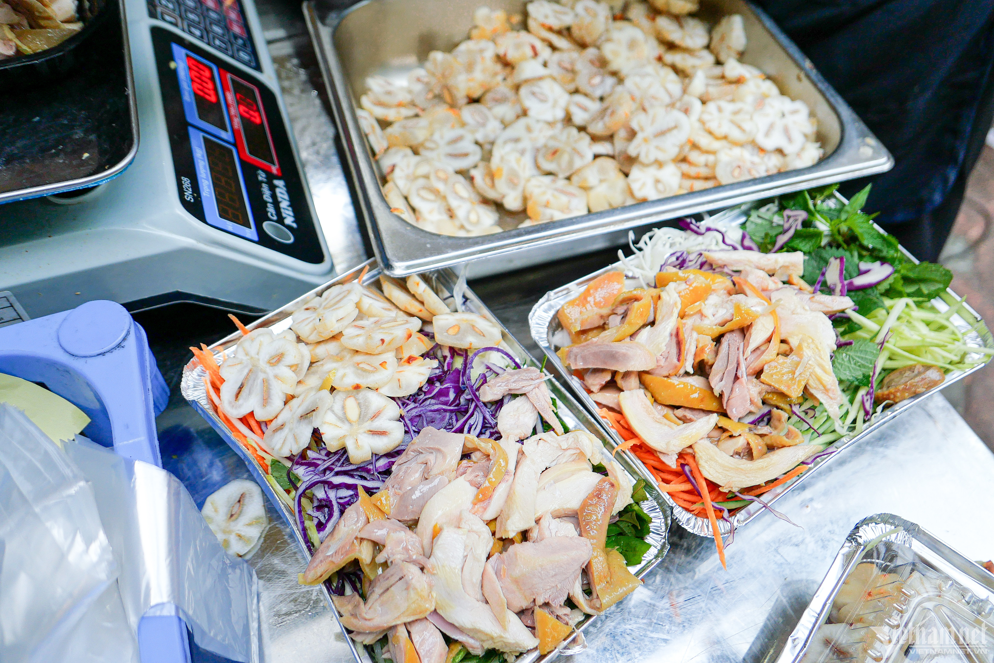 Các loại nguyên liệu được "cân đo đong đếm" kĩ lưỡng theo tỉ lệ nhất định để tạo nên một suất gỏi gà măng cụt phục vụ thực khách. Mỗi suất dành cho 2-3 người có giá 250.000 đồng và suất dành cho 4-5 người có giá 350.000 đồng.