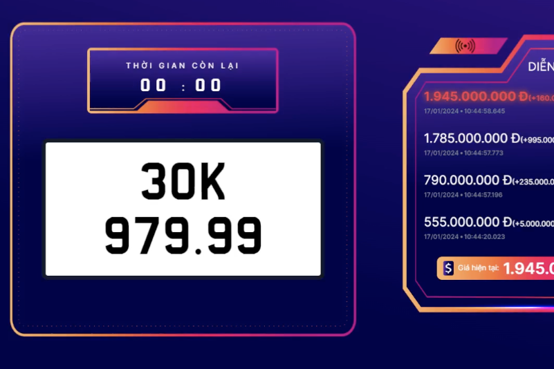 Tính chung trong cả ngày 17/1, biển số "tam hoa, thần tài" khá đẹp của Hà Nội 30K-979.99 ở ca sáng đã trúng đấu giá cao nhất với mức 1,945 tỷ đồng.