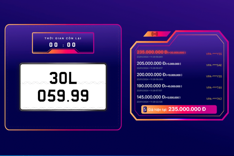 Phiên đấu giá biển số ô tô chiều ngày 23/1 kết thúc với hai biển số 30L-126.66 của Hà Nội và 51L-386.86 của TP.HCM chốt giá cao nhất lần lượt chỉ 290 triệu đồng và 225 triệu đồng.