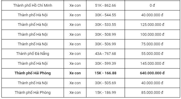 Khung giờ đấu giá cuối cùng từ 15h đến 16h trong ngày 31/10 đã kết thúc với mức giá trúng cao nhất 155 triệu đồng thuộc về biển có đuôi thần tài: 30K - 569.39 (Hà Nội). Biển số xe tải 88C - 268.68 (Vĩnh Phúc) có giá cao thứ 2, đạt 110 triệu đồng. Hai biển số 51K - 869.89 và 51K - 855.66 của TP.HCM đồng mức giá 105 triệu đồng. Đáng chú ý, nhiều biển số đẹp được chốt ở mức giá khá "mềm", ví dụ như: 49C - 333.66 (40 triệu đồng), 18A - 388.66 (50 triệu đồng),...