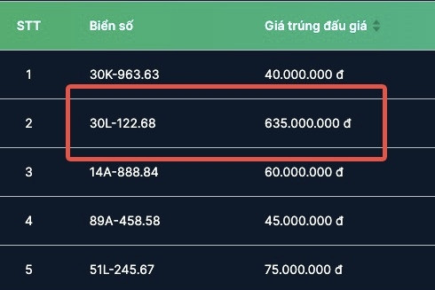 Tuy nhiên, giá trị biển trên vẫn thấp nhất so với các biển ngũ quý 7 của các tỉnh thành khác đã lên sàn trước đó. Cụ thể, biển 30K - 777.77 của TP.Hà Nội trúng giá lên đến 9,365 tỷ đồng (phiên đấu ngày 11/1/2024); biển 72A - 777.77 của Bà Rịa-Vũng Tàu cũng chốt giá 6,85 tỷ đồng (phiên đấu ngày 23/12/2023); biển 51K - 777.77 của TP.HCM giá 3,64 tỷ đồng (phiên đấu ngày 22/9/2023).