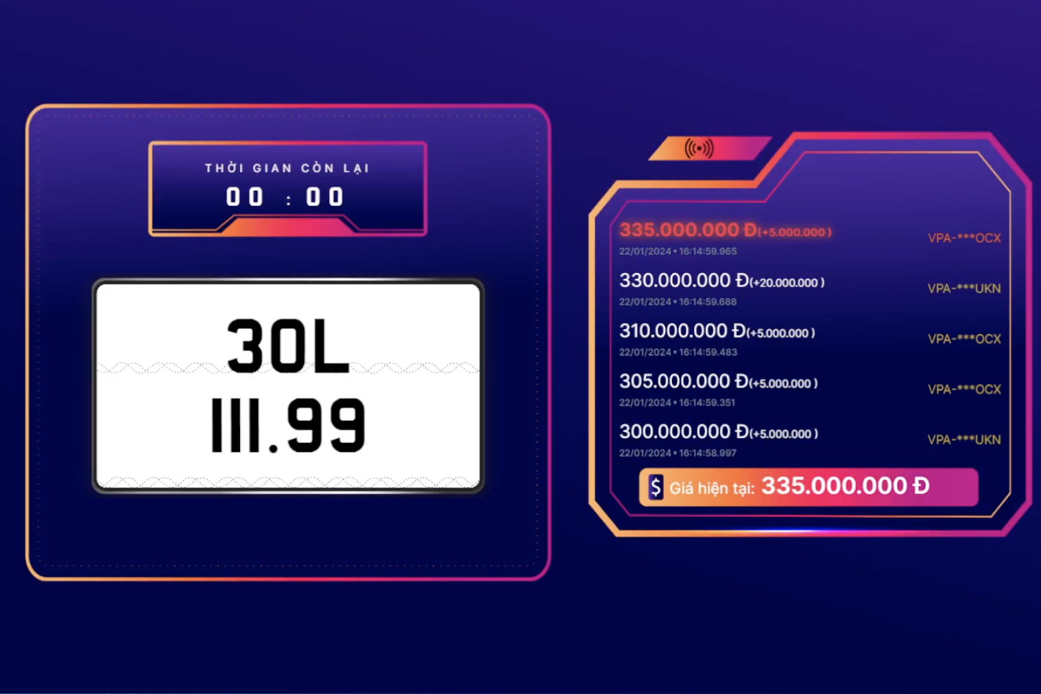 Đáng chú ý, khi theo dõi thời gian đấu giá biển số 30L-059.99, bước trả giá cho biển số này đã tăng vọt chỉ trong 5 giây cuối, từ mức 145 triệu đồng lên 235 triệu đồng. Điều này cho thấy ở những biển số được cho là đẹp, giới săn biển đã đầu tư chuẩn bị "chiến thuật" căn giờ để "chốt hạ".