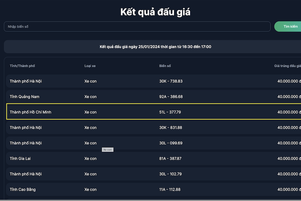 Theo danh sách kết quả được Công ty đấu giá hợp danh Việt Nam (VPA) công bố, biển số 30L-159.59 của Hà Nội trúng giá cao nhất cũng chỉ đạt 170 triệu đồng. Biển số 88A-683.88 của Vĩnh Phúc có giá cao thứ 2, đạt 165 triệu đồng.