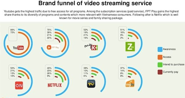 Khảo sát của Q&Me trong tháng 2/2020 cho thấy, 5 dịch vụ xem truyền hình trực tuyến có tính phí được biết đến nhiều nhất tại Việt Nam hiện nay là FPT Play, Netflix, K+, VTV Cab On và Zing TV. Trong đó, FPT Play dẫn đầu cả về lượng người biết đến (70%), lượng người tiếp cận với dịch vụ này (39%) và lượng thuê bao trả tiền hiện tại (22%).