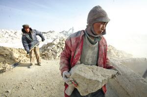 Cả xưởng Giai Nhĩ Tư bị một lớp bụi dày khoảng 20 mm bao phủ, chỉ cần một cơn gió nhẹ thổi qua cũng đủ làm bụi bám đầy lên miệng, lên mũi công nhân.  Ngày 10/12, các công nhân trong xưởng vẫn làm việc cật lực, một anh công nhân mặc chiếc áo màu hồng vá chằng chịt, tay cầm một chiếc búa và đập những phiến đá rộng chừng 30 -40 cm mét vuông còn một người khác đang dùng tay xếp những tảng đá lên xe đẩy. Mất khoảng 30 phút, hai người đã xếp đầy một xe đá.