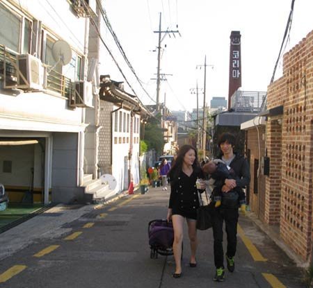 | Một gia đình trẻ trên đường làng Hanok Bukchon |