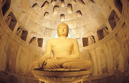 | Động Seokguram với vô vàn tượng Phật điêu khắc tinh xảo, nổi bật là tượng Phật thiền định, tạc bằng đá hoa cương cao 3,5m. |