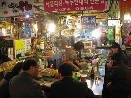 | Người Hàn Quốc thết đãi nhau trên ghế kê dọc mỗi quầy hàng, trong các gian gác nhỏ phía trên mỗi quầy hàng. |