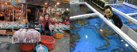 | Trong chợ Pohang Jukdo, sản vật biển treo thõng khắp nơi: bạch tuộc lớn bằng cả vòng tay ôm, cua biển có mai to ngang mặt người. |